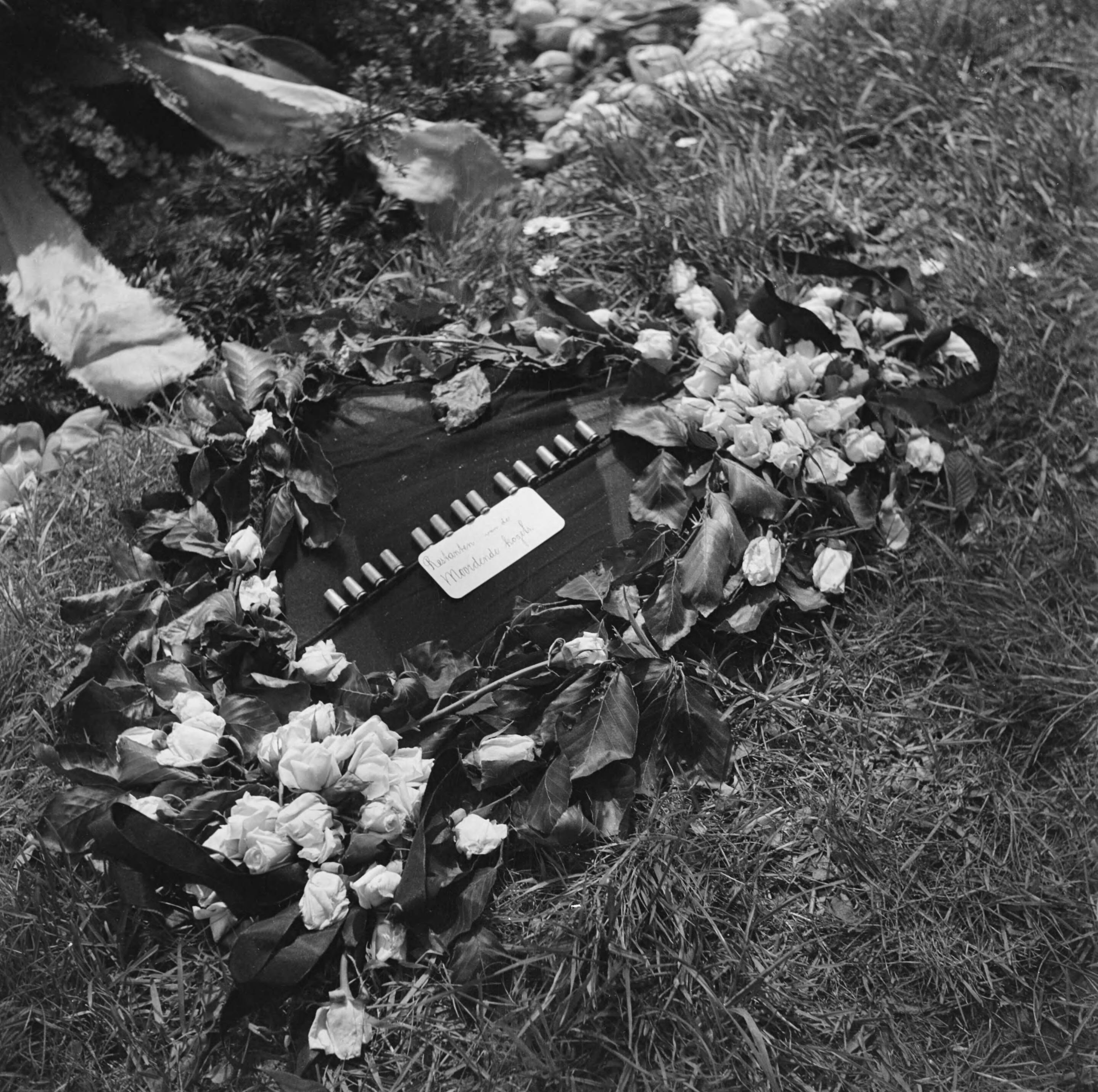 Ook Haarlem heeft zijn monument voor acht helden, die op 7 maart 1945 laaghartig zijn vermoord tegen een schuilkelder aan de Dreef. Krans met patroongordel en kaartje waarop staat ¨restanten van de moordende kogels¨