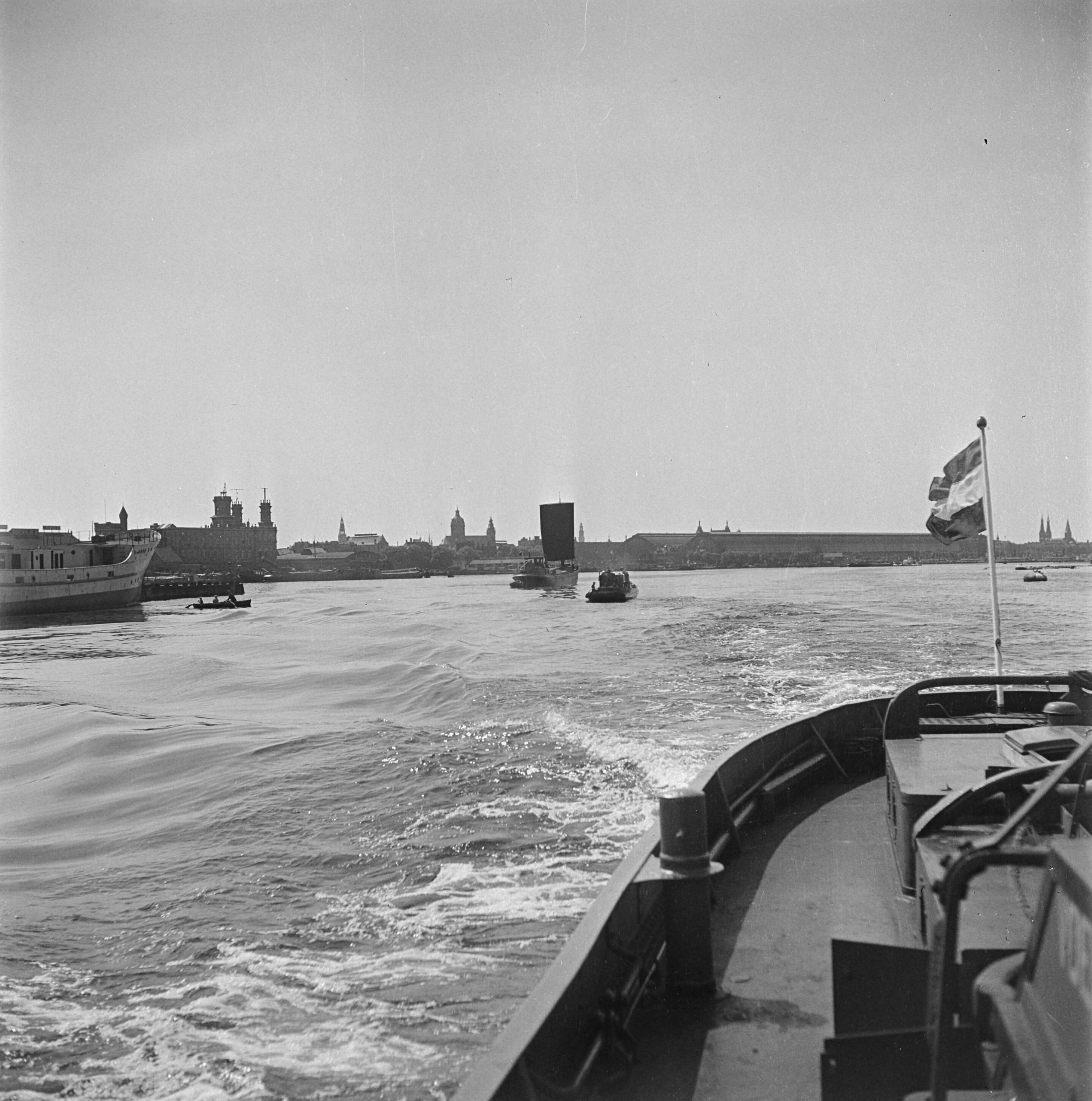 Gezicht op Centraal Station. Links een binnenvaartschip met zeil