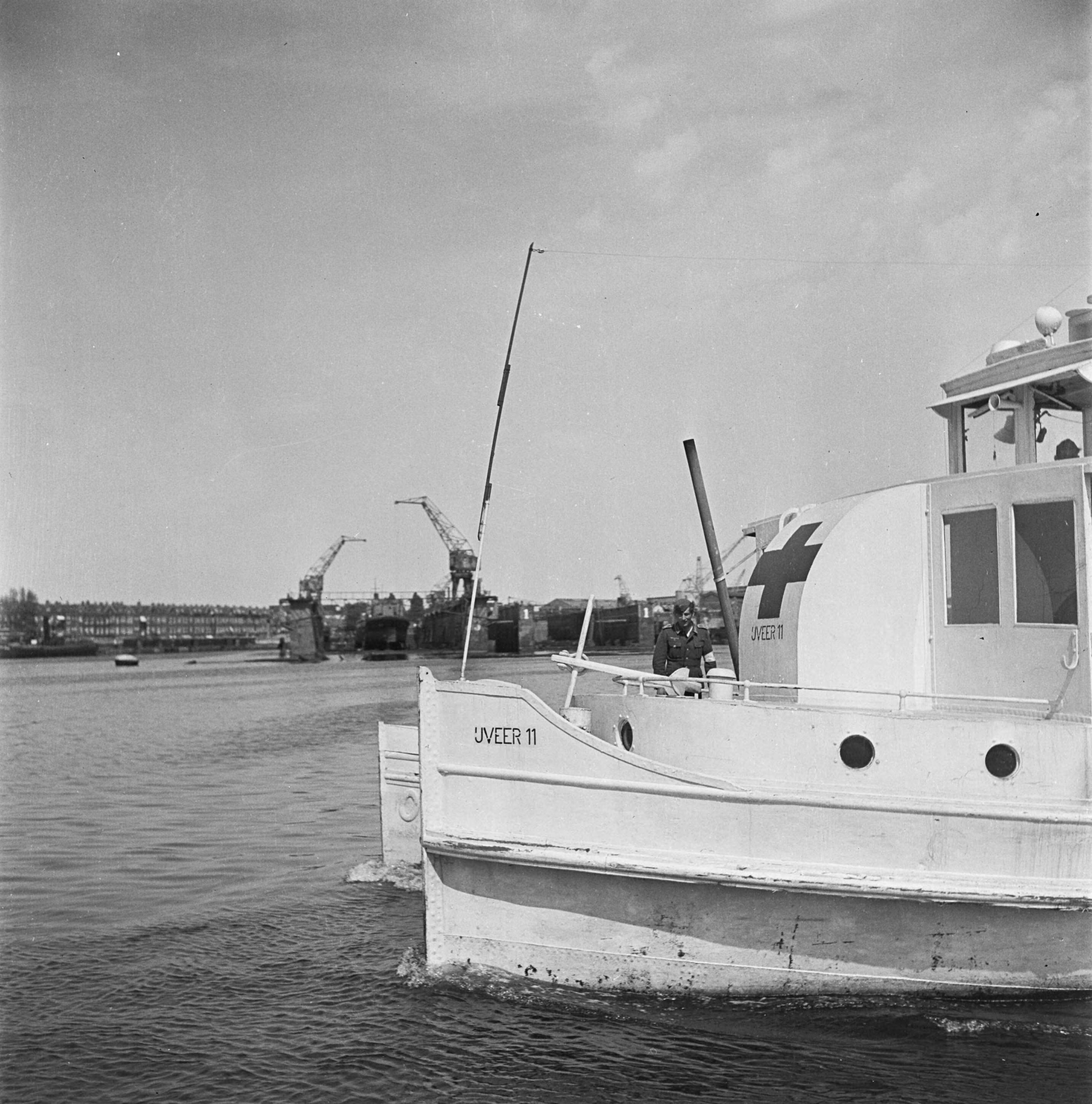 IJveer 11 als Rode Kruisboot Bij de plecht staat een Duitse militair met armband
