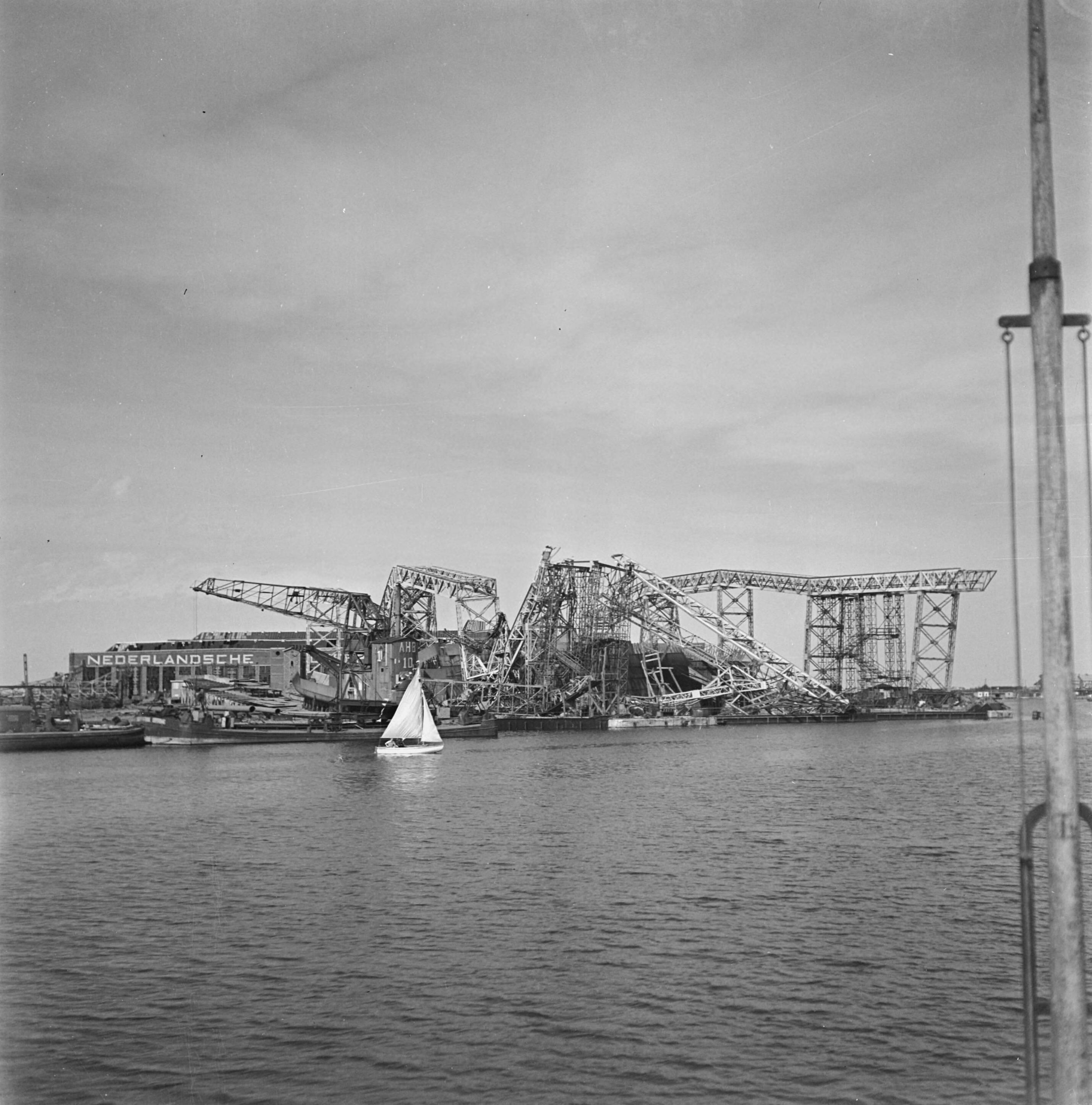 Verwoeste haveninstallaties. Een zeilbootje vaart voorbij