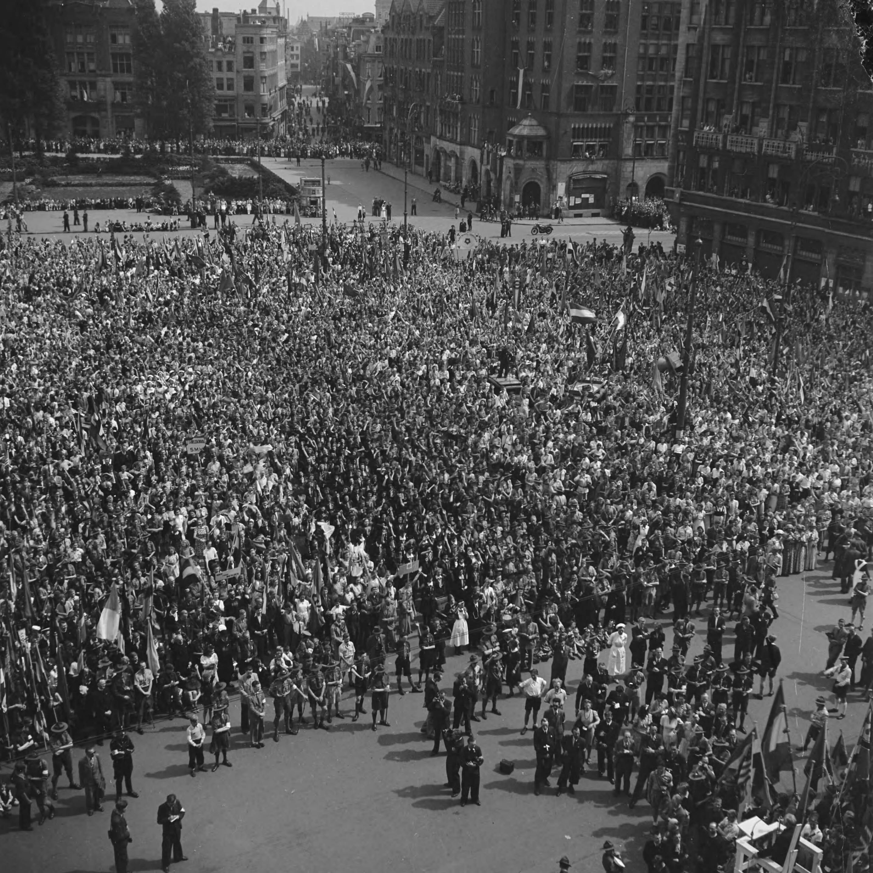Jeugddemonstratie op de Dam te Amsterdam. Grote menigte voor het Palais op de Dam