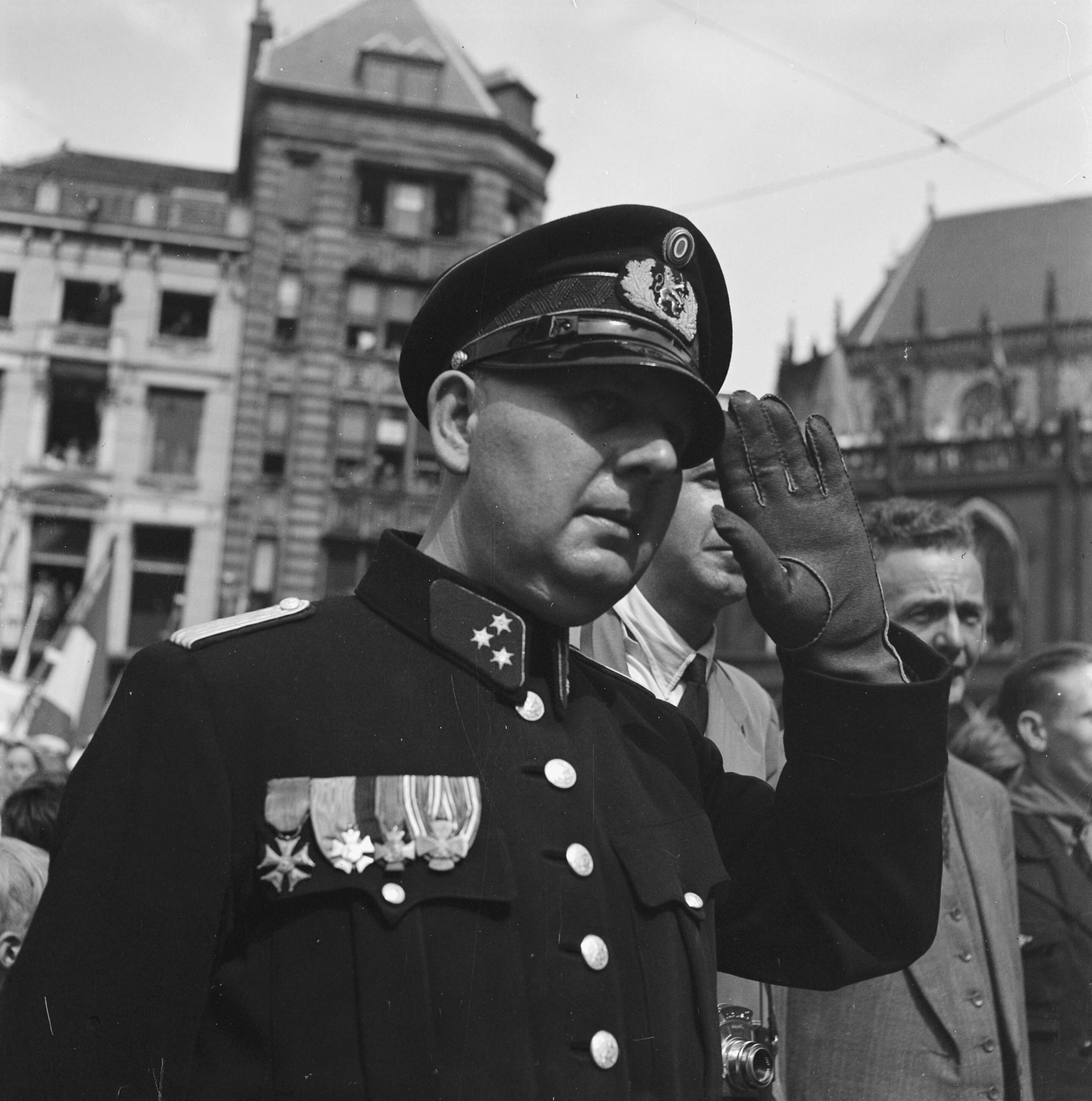 Jeugddemonstratie op de Dam te Amsterdam politieman of brandweerman met der rang van kapitiein, brengt groet. Op zijn borst onderscheidingen