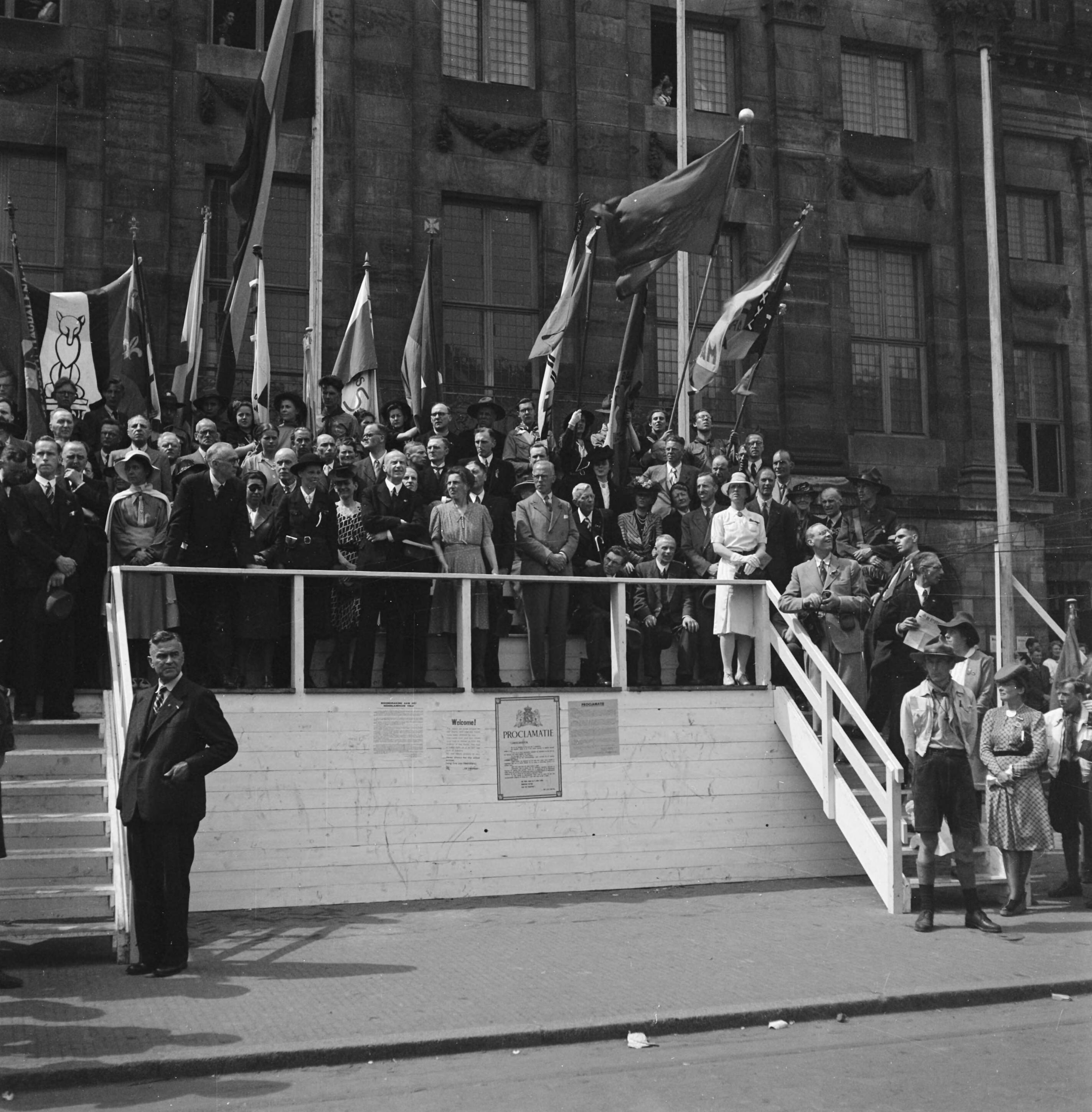 Jeugddemonstratie op de Dam te Amsterdam podium met autoriteiten voor het Paleis op de Dam