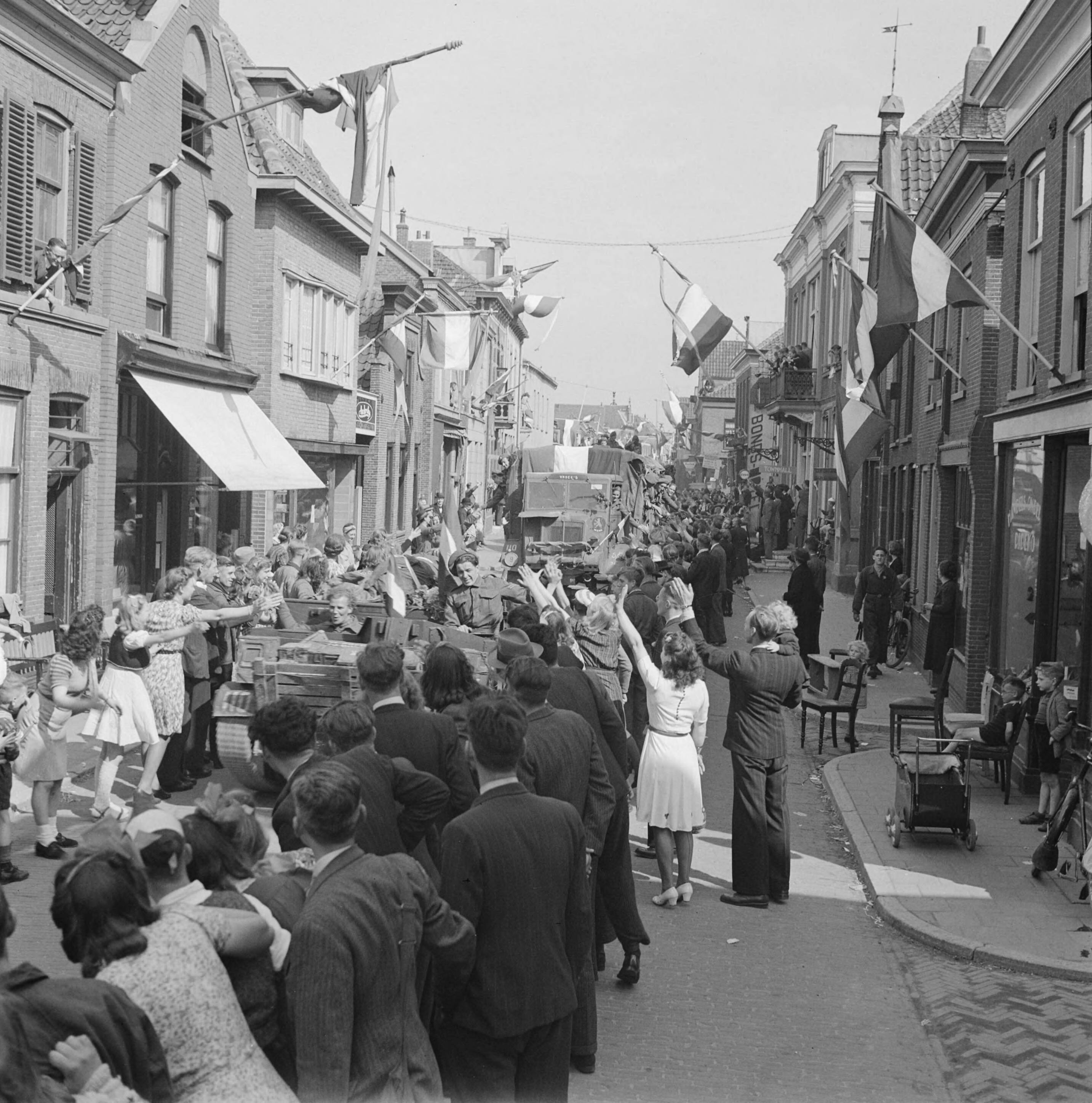 Prinses Irene Brigade trekt door de Tolstraat te Bodegraven toegejuicht door een mensenmenigte. Rechts op het raadhuis het bord "Townhall"