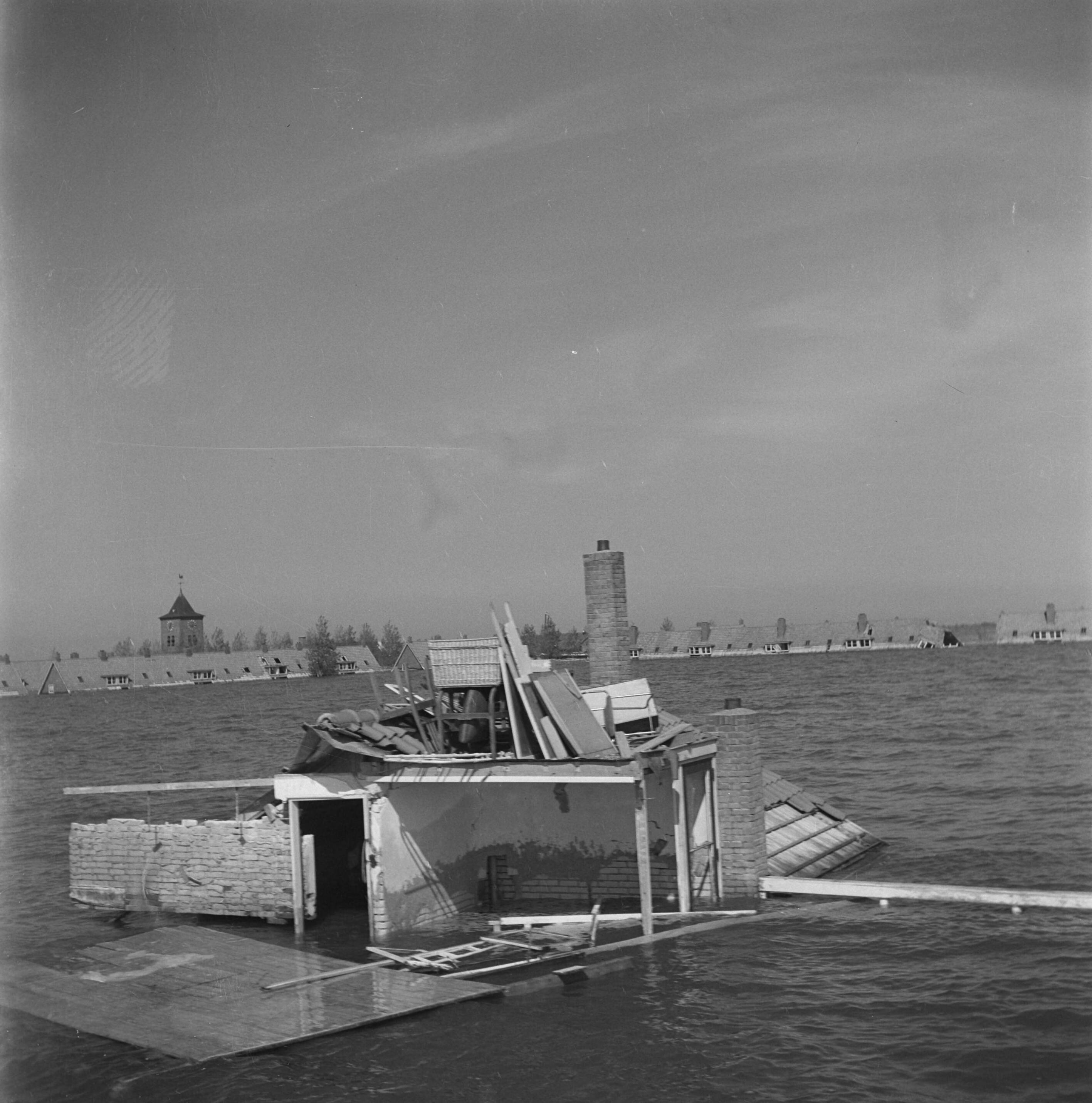 Overstroming van de Wieringmeerpolder. Op 17 april 1945 hebben de Duitsers nog de dijk doorgestoken die de Wieringermeer van het IJsselmeer scheidt.