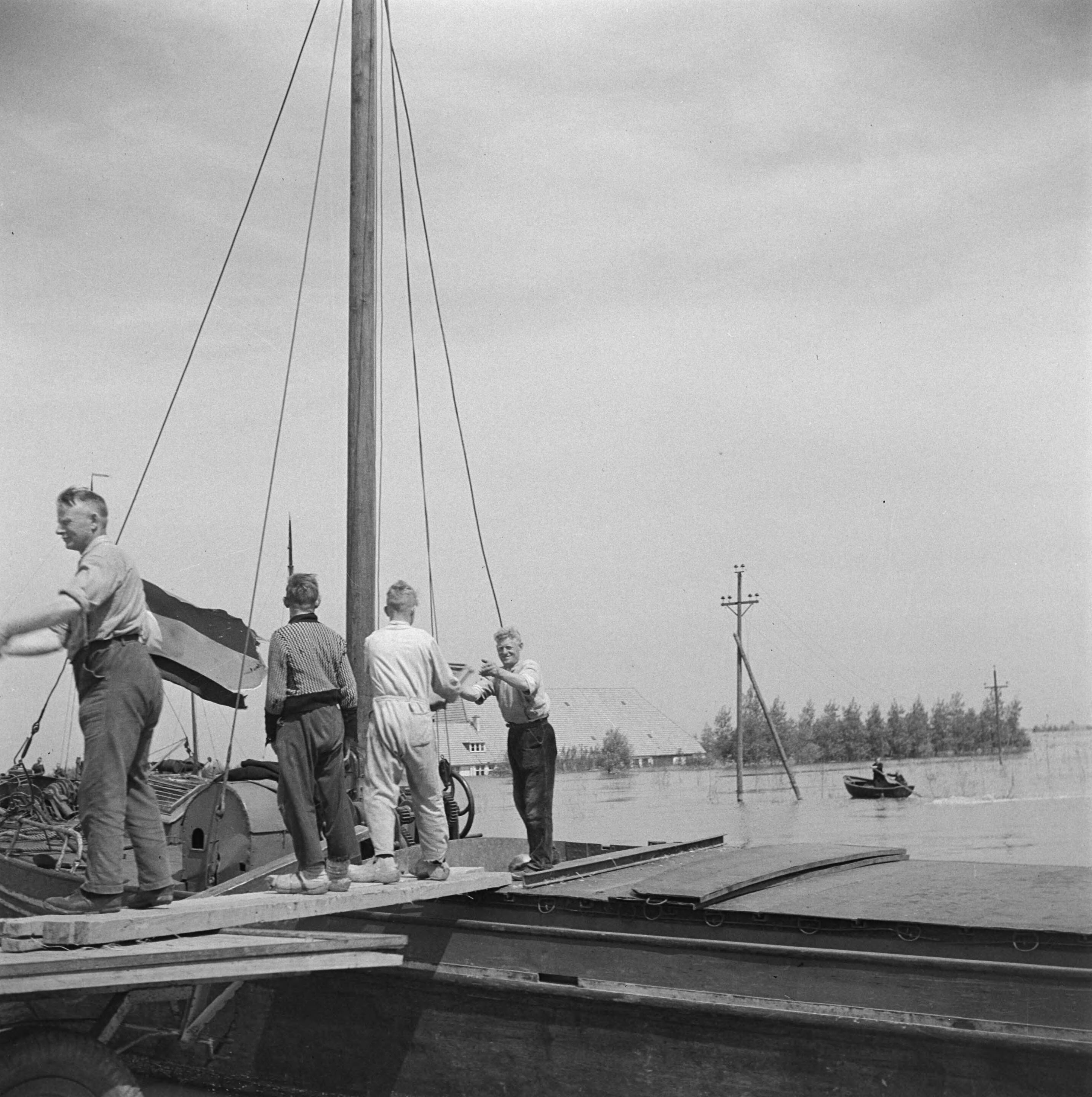 Overstroming van de Wieringmeerpolder. Op 17 april 1945 hebben de Duitsers nog de dijk doorgestoken die de Wieringermeer van het IJsselmeer scheidt.