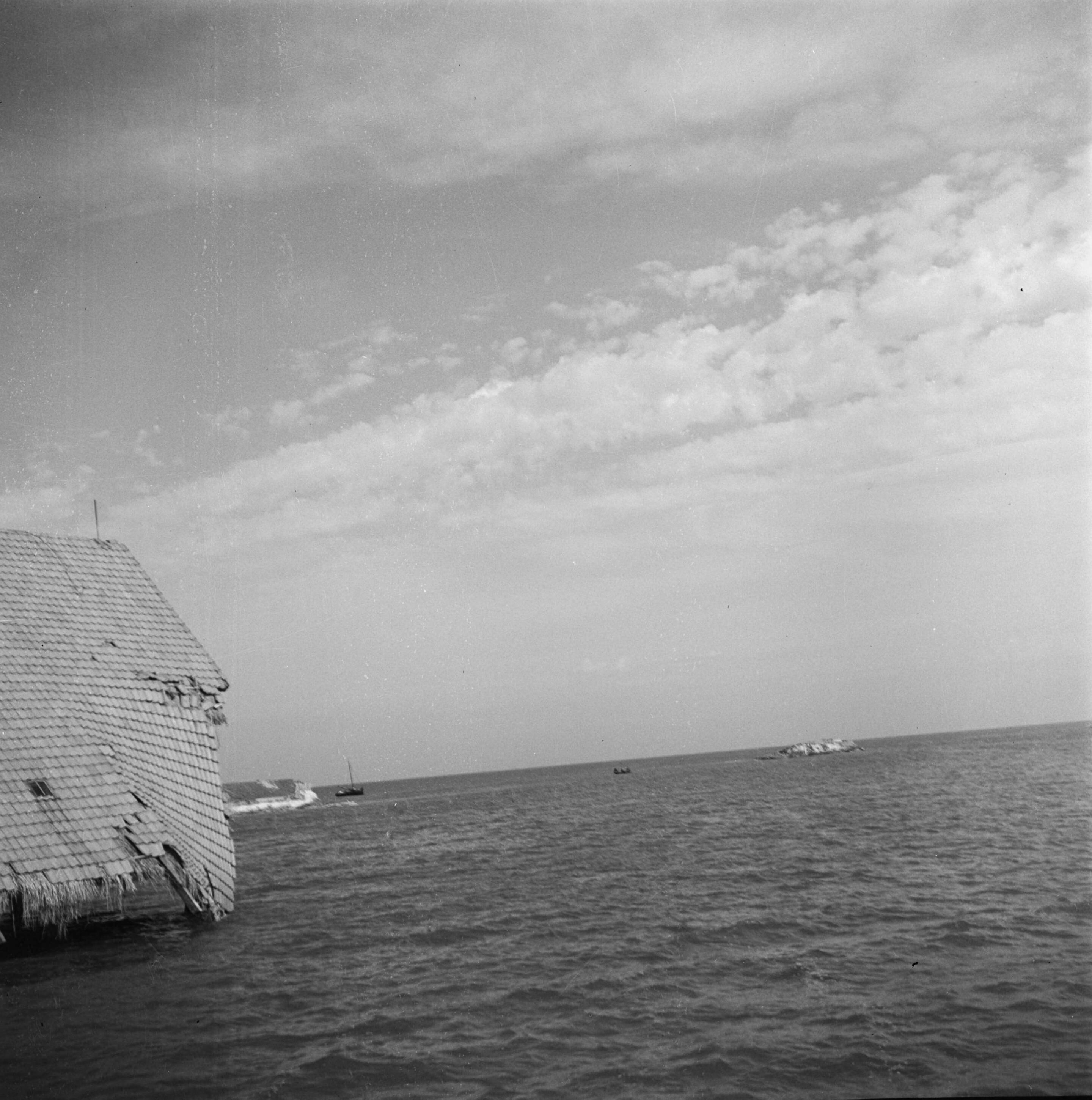 Overstroming van de Wieringmeerpolder. Op 17 april 1945 hebben de Duitsers nog de dijk doorgestoken die de Wieringermeer van het IJsselmeer scheidt.