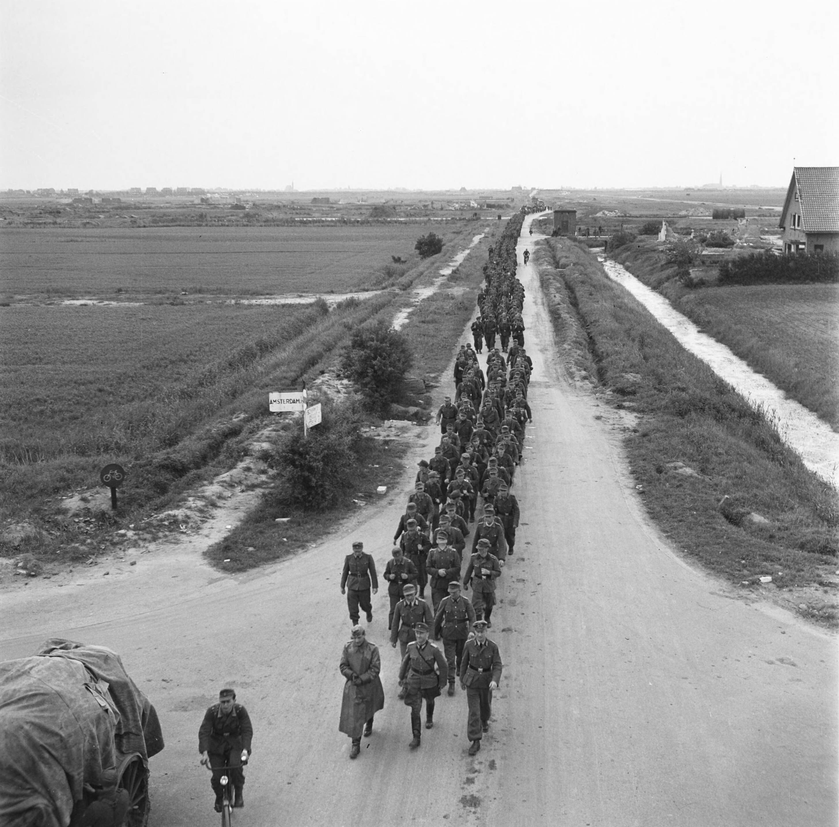 Colonne Duitsers op de terugweg na het inleveren van wapens en uitrustingsstukken
