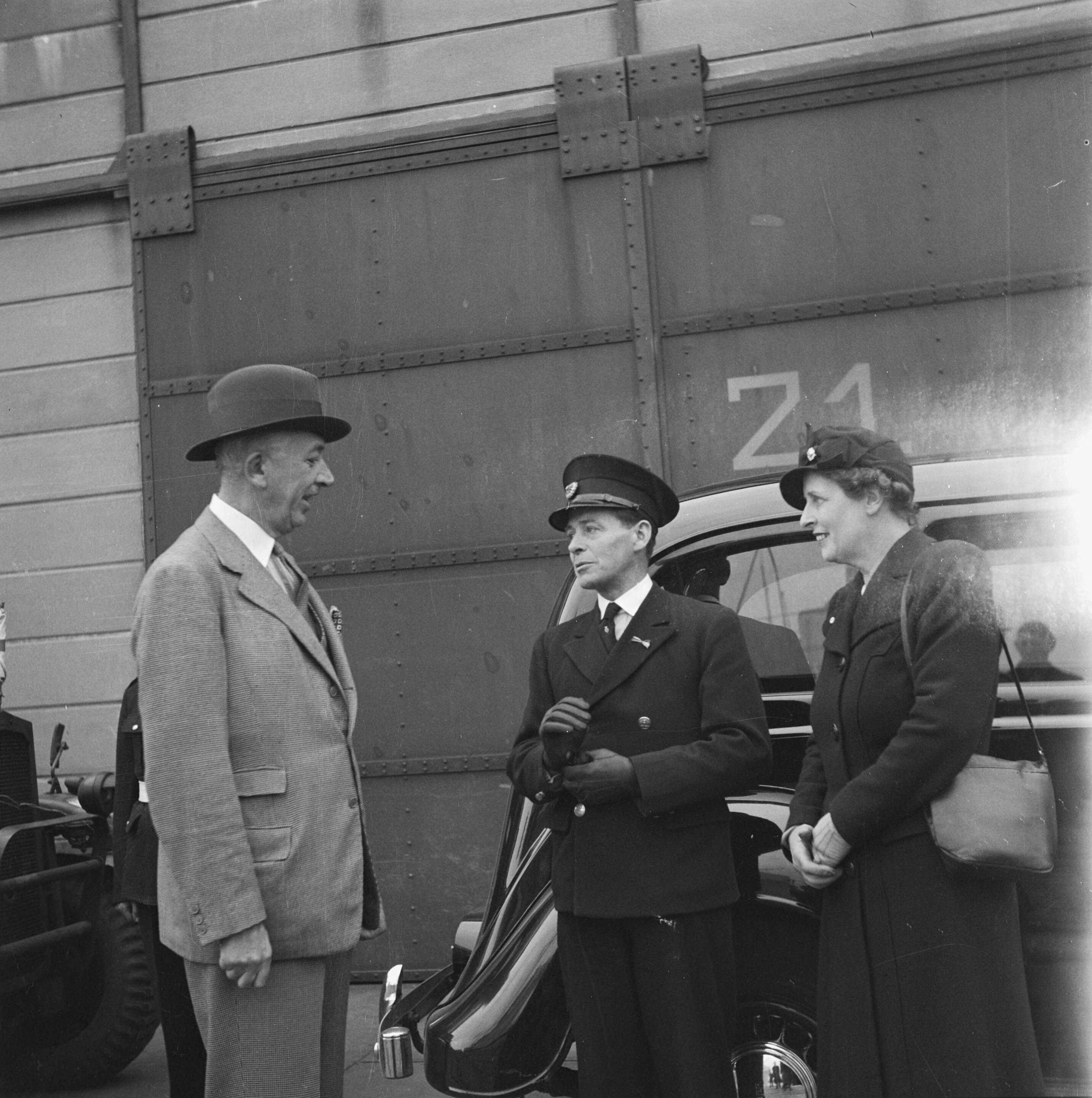 Aankomst van de Engelse gezant Sir Neville Bland aan de Lloydkade te Rotterdam. Sir Neville Bland en echtgenote onmoeten op de kade hun oude chauffeur L.P. Luit, die de auto van de ambassadeur liet onderduiken en zelf in Nederland bleef