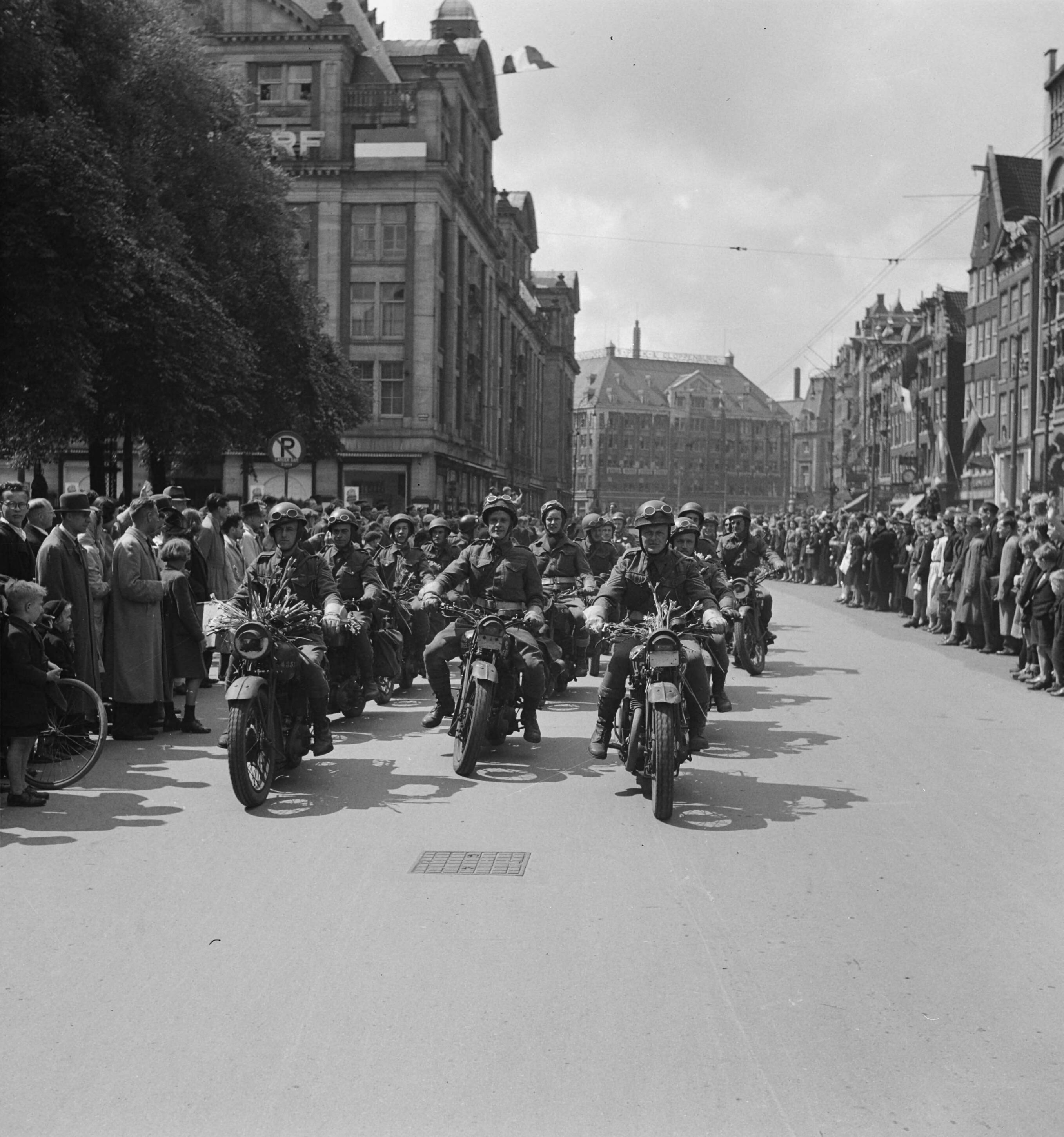 Parade van de Prinses Irene Brigade in Amsterdam Motorrijders op het Damrak