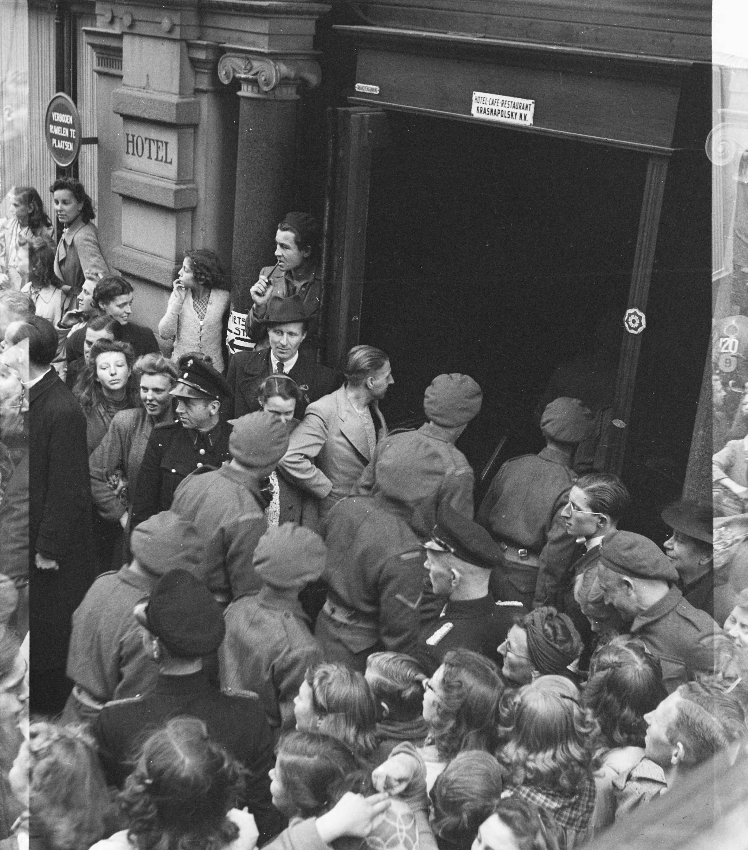 Parade van de Prinses Irene Brigade in Amsterdam Soldaten gaan Hotel Krasnapolsky binnen