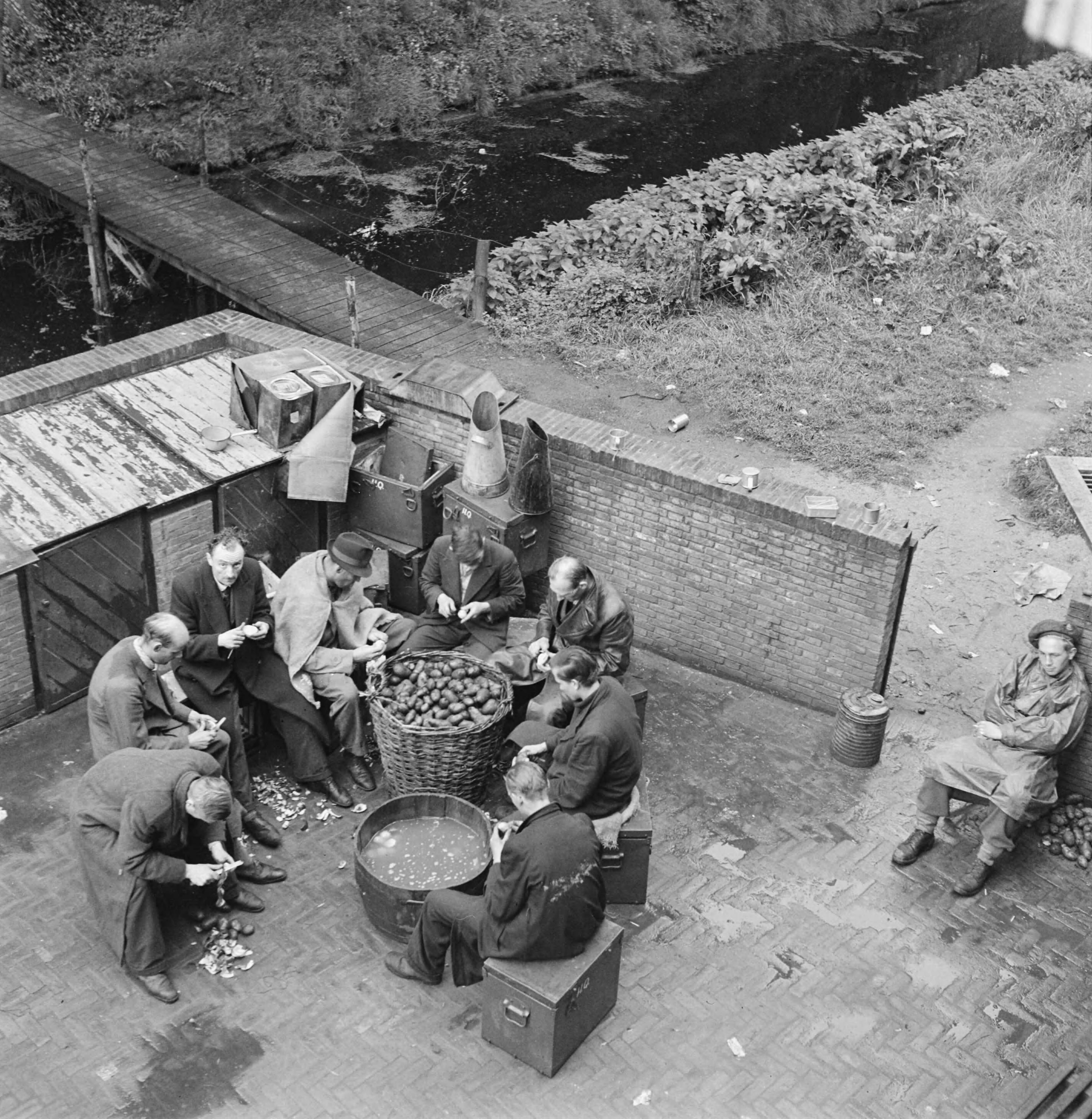 Geinterneerde NSB-ers, onder bewaking, aan het aardappels schillen te Den Haag