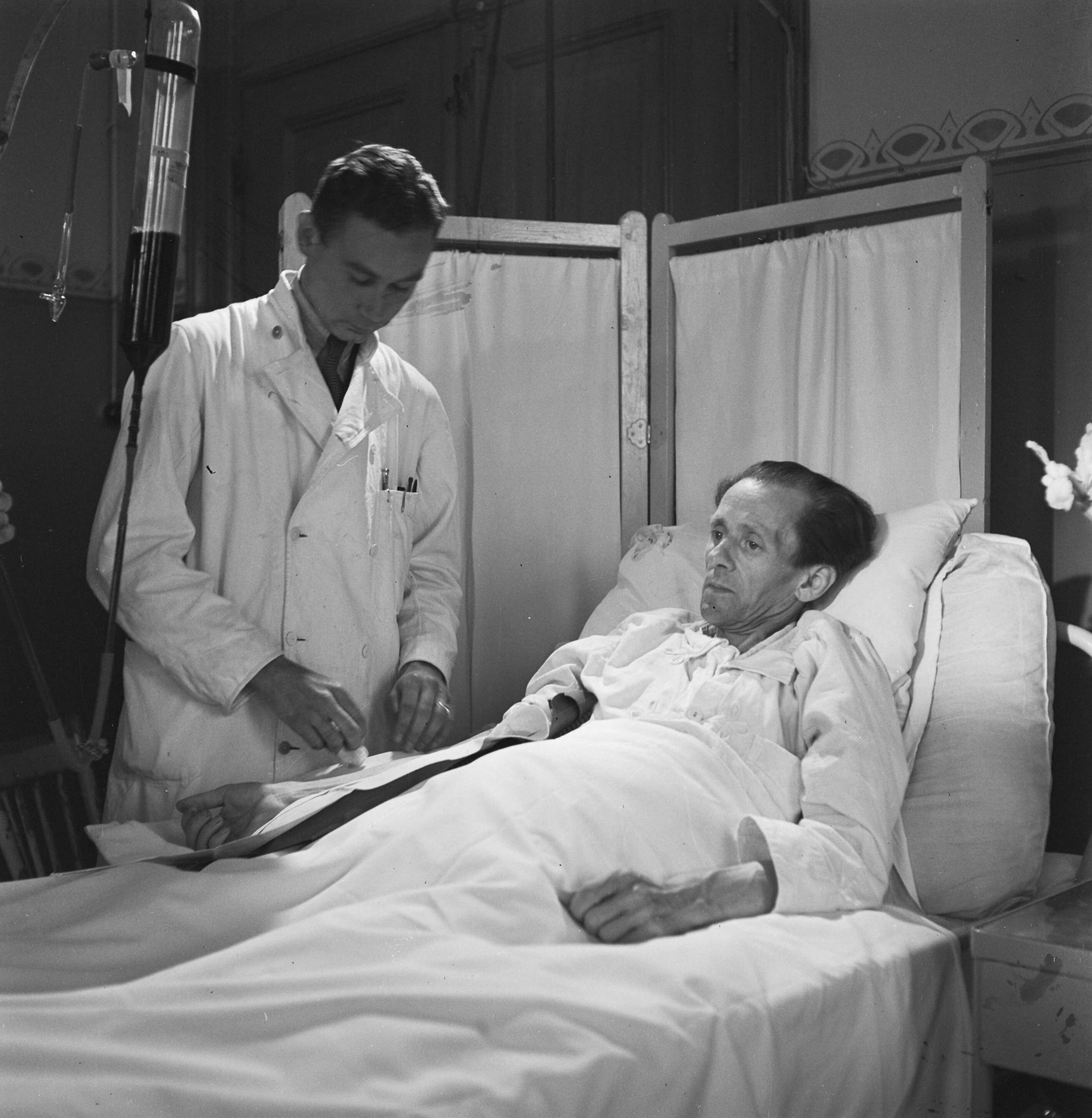 Verpleging van lijders aan hongeroedeem in het Binnengasthuis te Amsterdam. Onder leiding van de doktoren Scherpenhuysen en Haverkamp wordt al het mogelijke gedaan om deze mensen weer spoedig op de been te helpen. Hier het toedienen van een bloedtransfusie