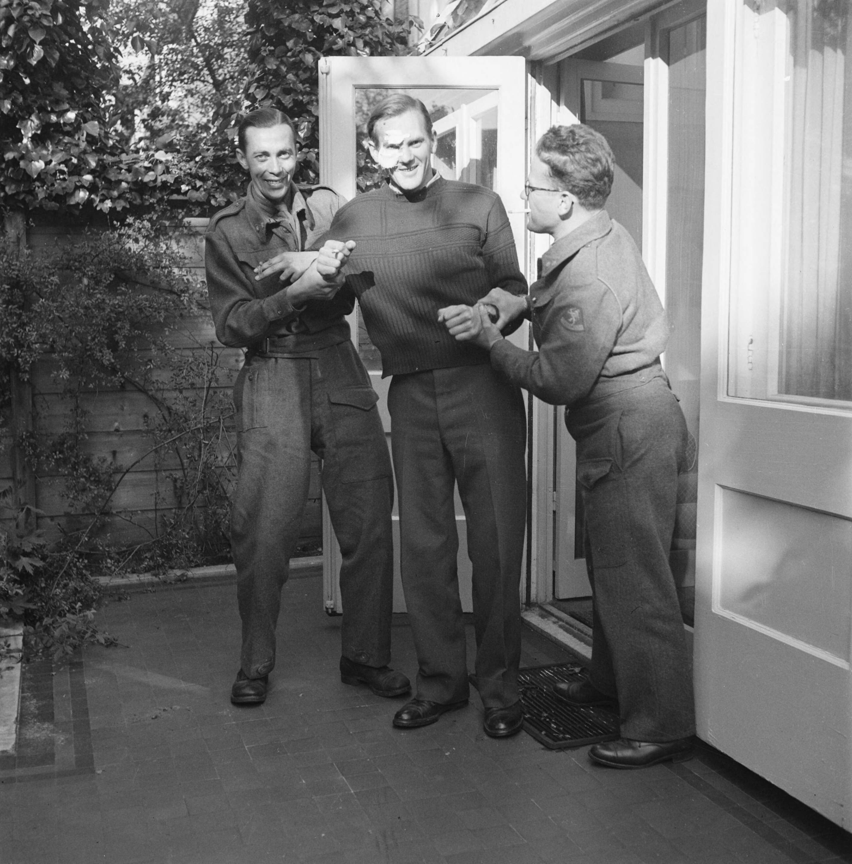 man met oogwond wordt ondersteund door twee geuniformeerde mannen