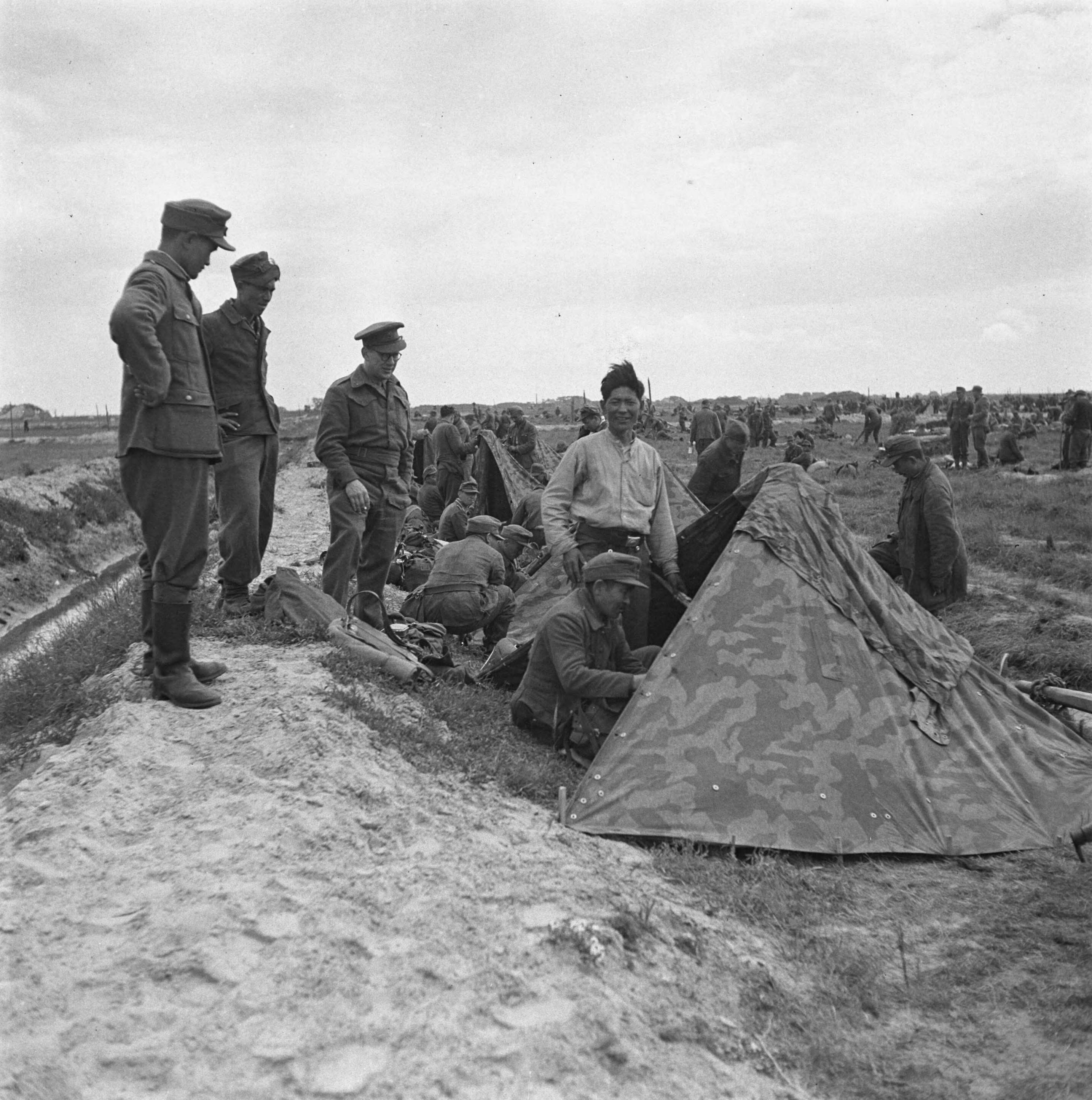 Duitse krijgsgevangenen van Aziatische afkomst bij een tent. Bij hen staat een Nederlandse officier