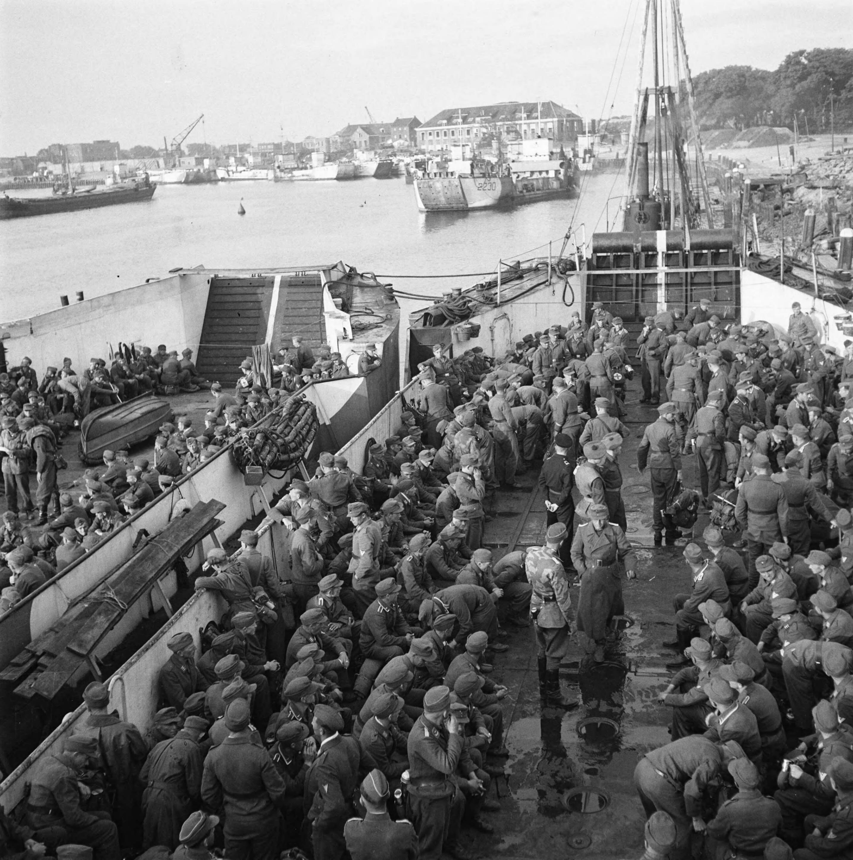 In Den Helder worden de ontwapende Duitse soldaten in LCT boten ingescheept met bestemming Harlingen, vanwaar te voet de lange reis naar de "Heimat" wordt afgelegd.