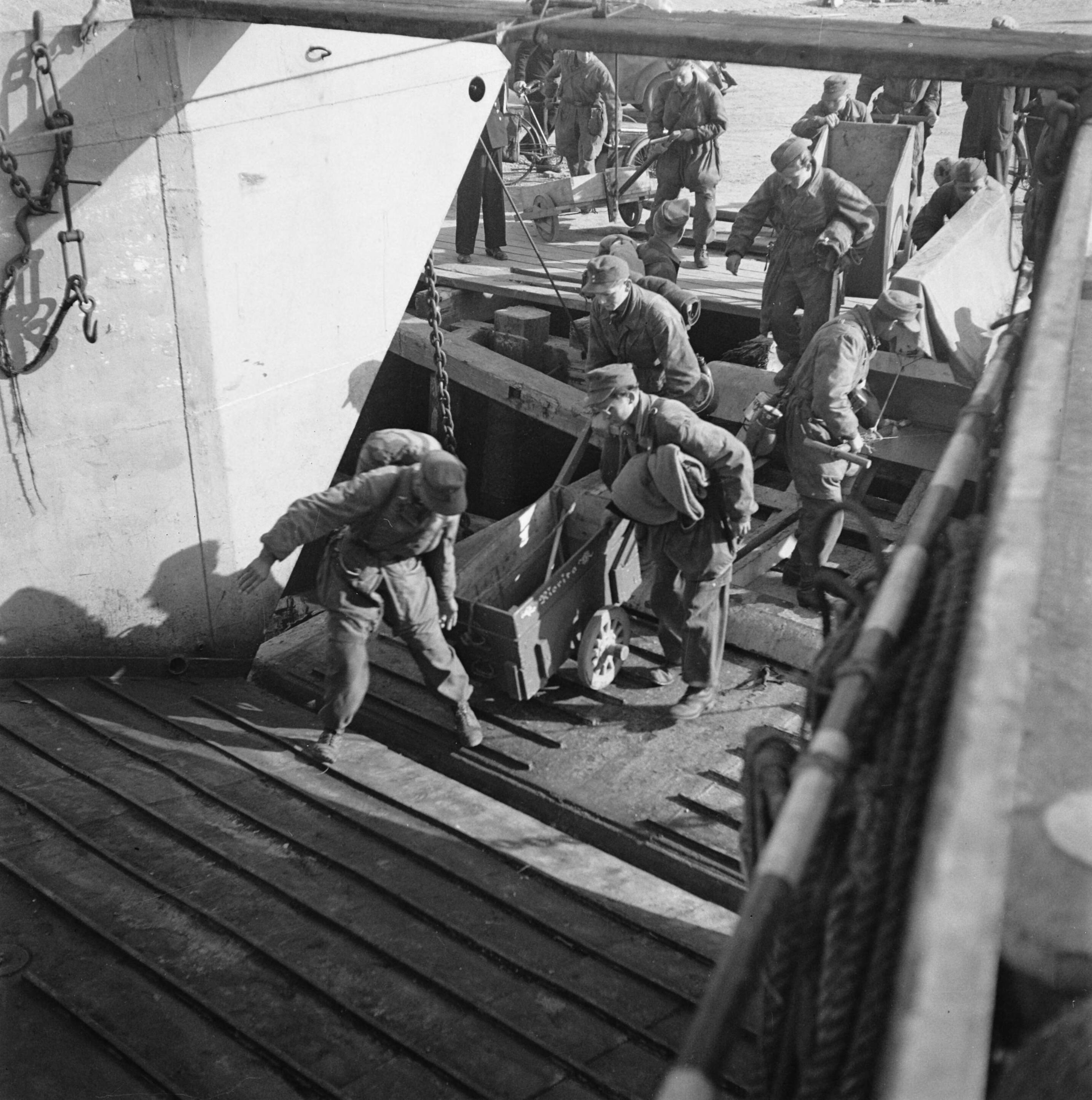 In Den Helder worden de ontwapende Duitse soldaten in LCT boten ingescheept met bestemming Harlingen, vanwaar te voet de lange reis naar de "Heimat" wordt afgelegd. De transportmiddelen die ze mochten behouden voor vervoer van hun bagage, worden aan boord gesleept