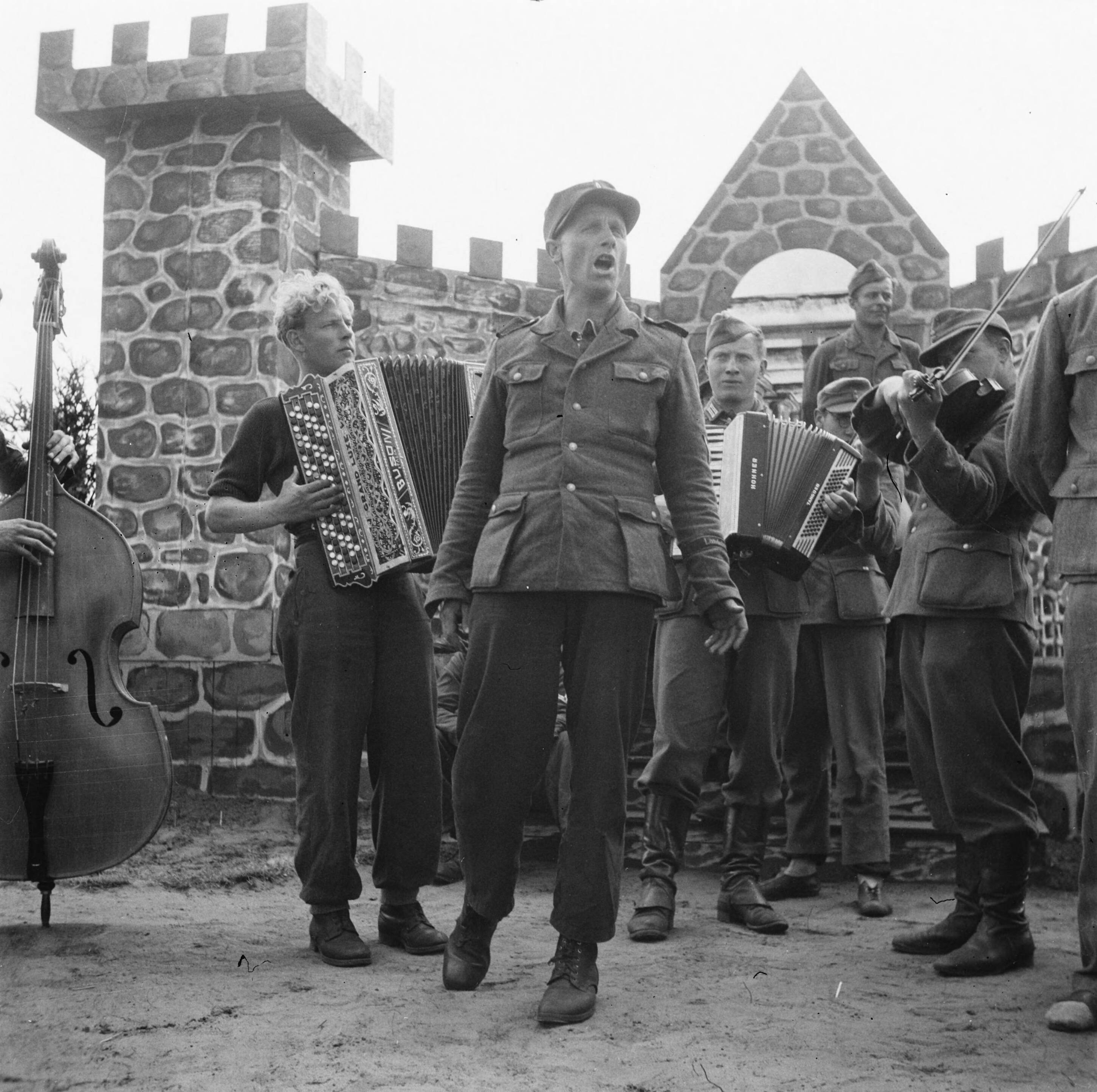 In kamp Harskamp is een "bühne" gebouwd, waar enkele voorstellingen per dag door en voor de kameraden worden gegeven. Zangers en muzikanten brengen hun nummer voor een talrijk publiek (Bijschrift Anefo)