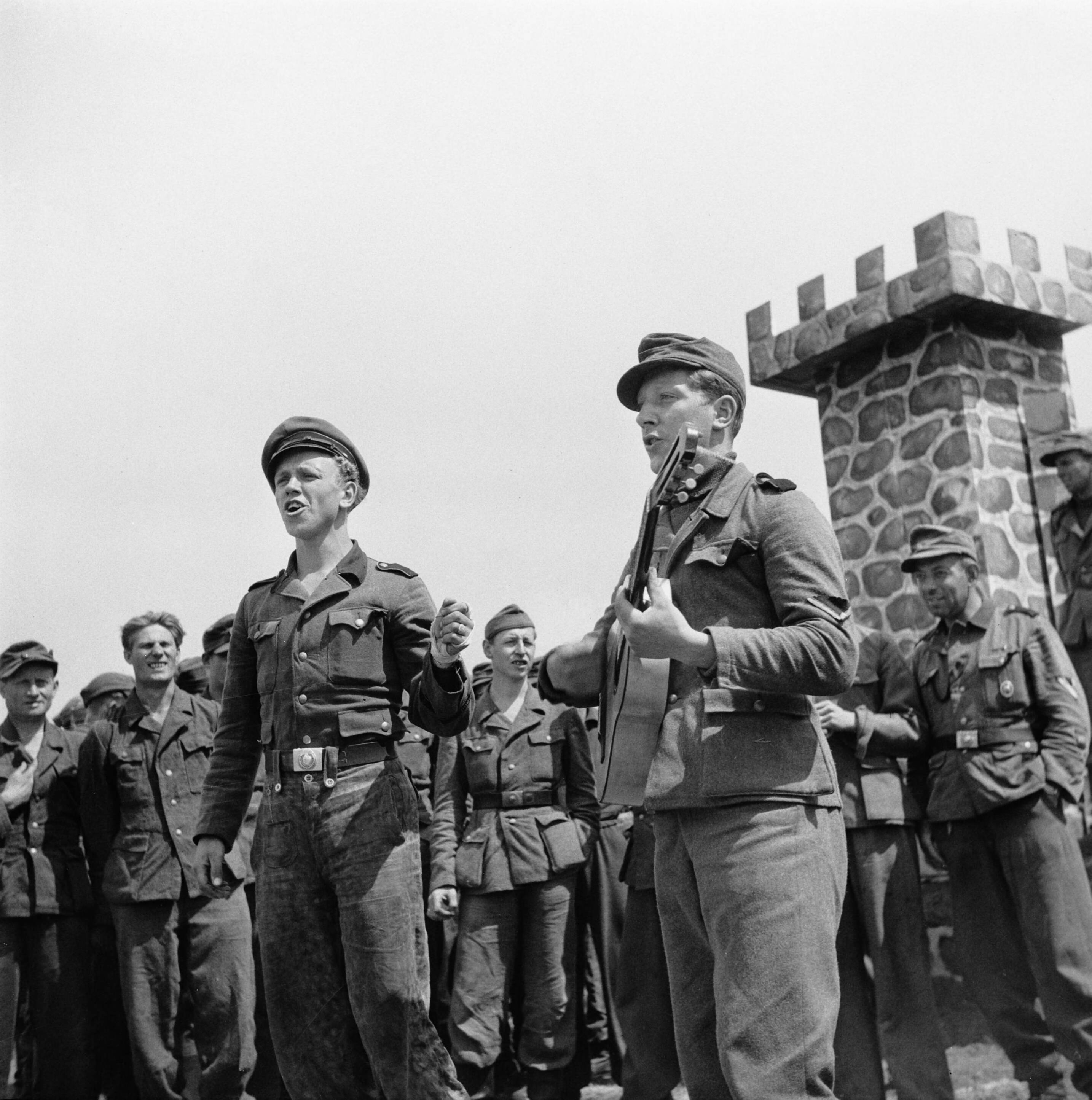 In kamp Harskamp is een "bühne" gebouwd, waar enkele voorstellingen per dag door en voor de kameraden worden gegeven. Zangers en muzikanten brengen hun nummer voor een talrijk publiek (Bijschrift Anefo)