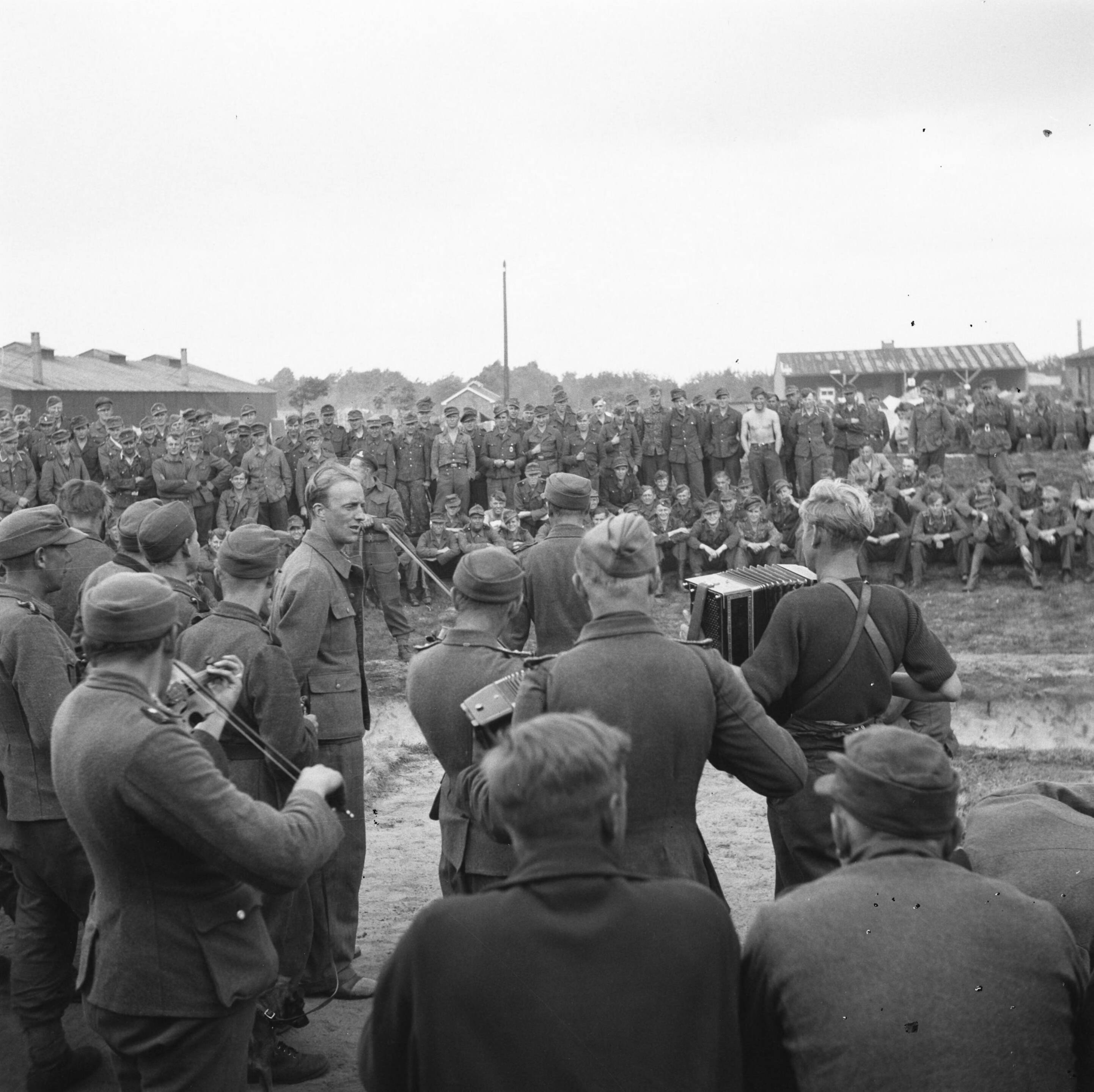 In kamp Harskamp is een "bühne" gebouwd, waar enkele voorstellingen per dag door en voor de kameraden worden gegeven. Zangers en muzikanten brengen hun nummer voor een talrijk publiek (Bijschrift Anefo)
