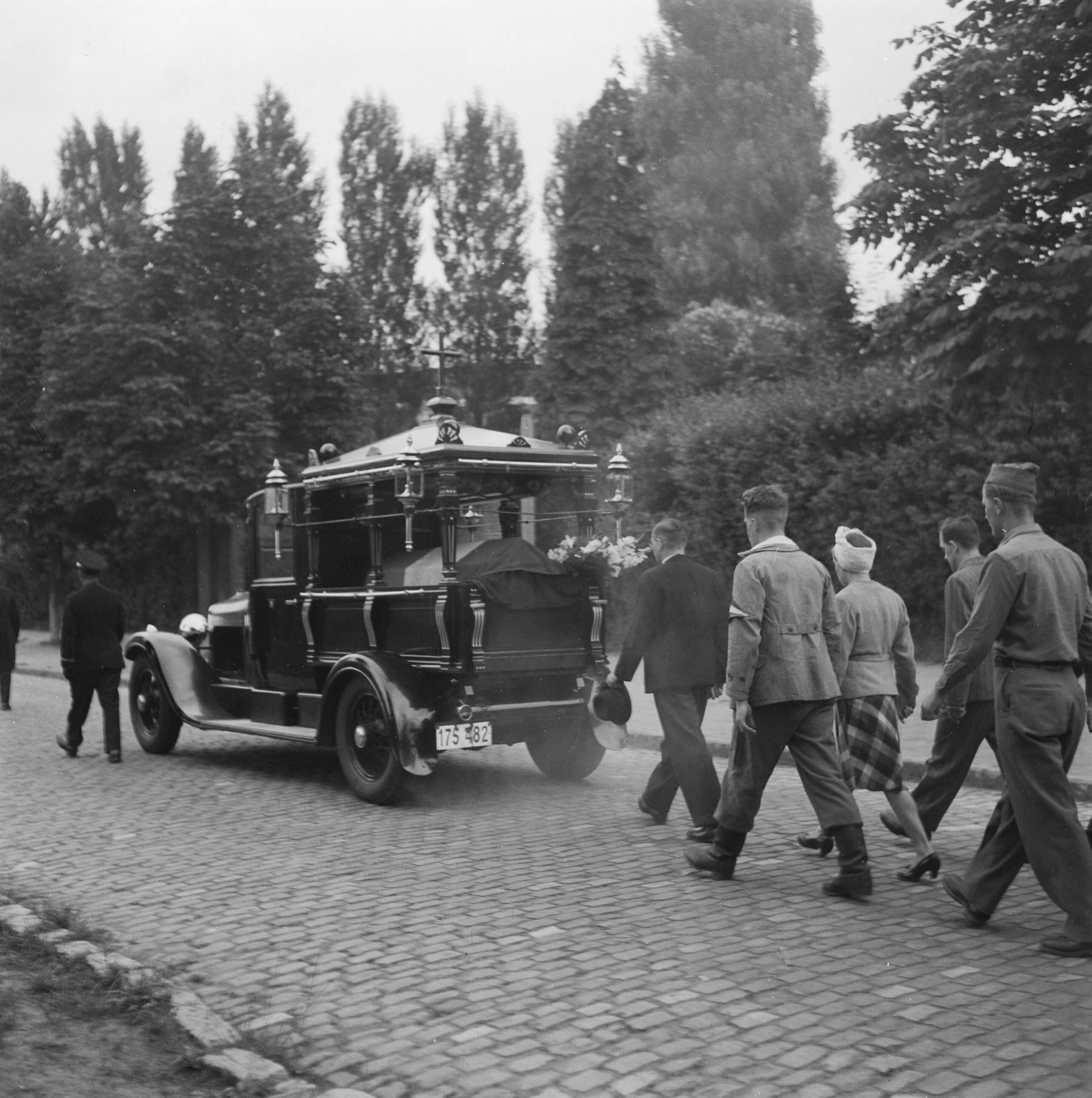 Uitvaart lijkwagen wordt gevolgd door geuniformeerde mannen en een vrouw