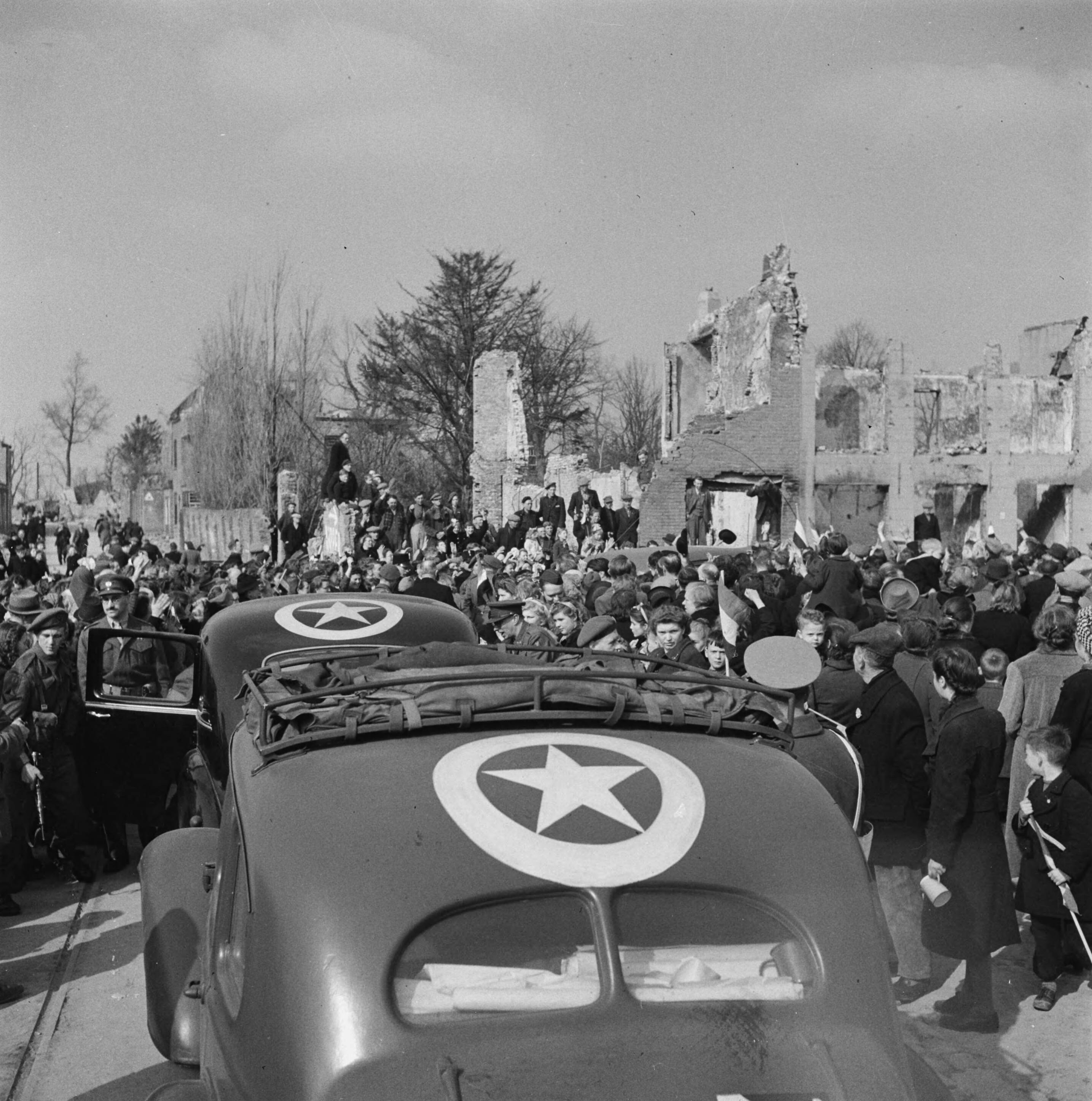 Twee auto's van de colonne van koningin Wilhelmina tussen een grote menigte in een verwoeste plaats