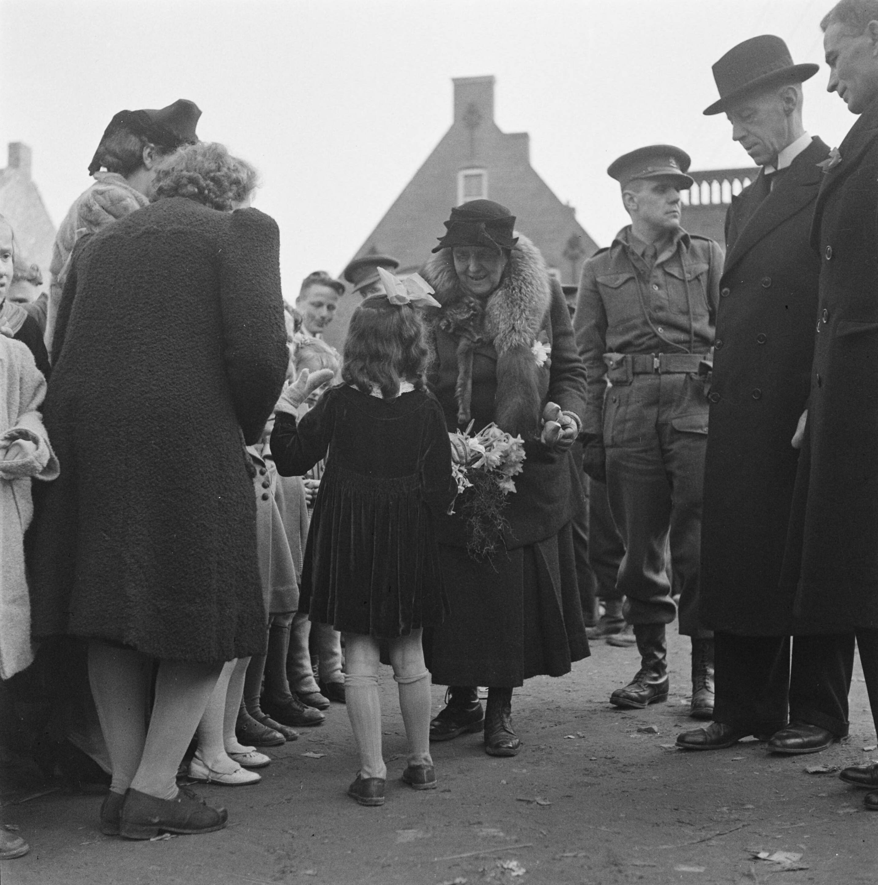Een Joodse onderduiktstertje te IJzendijke overhandigt koningin Wilhelmina een bos bloemen