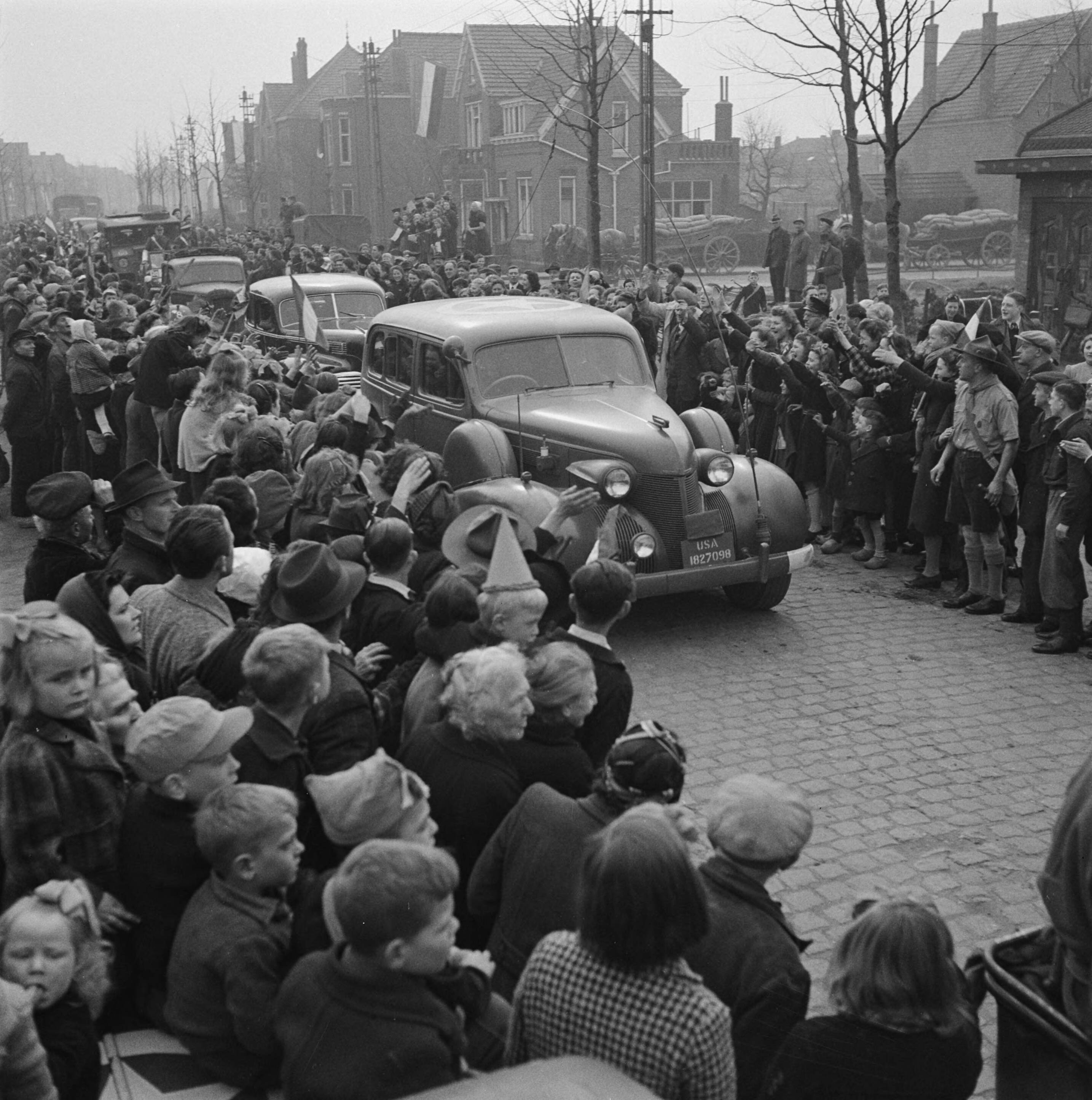 De colonne auto's van de stoet van koningin Wilhelmina rijdt een plaats binnen, waar de bevolking is uitgelopen