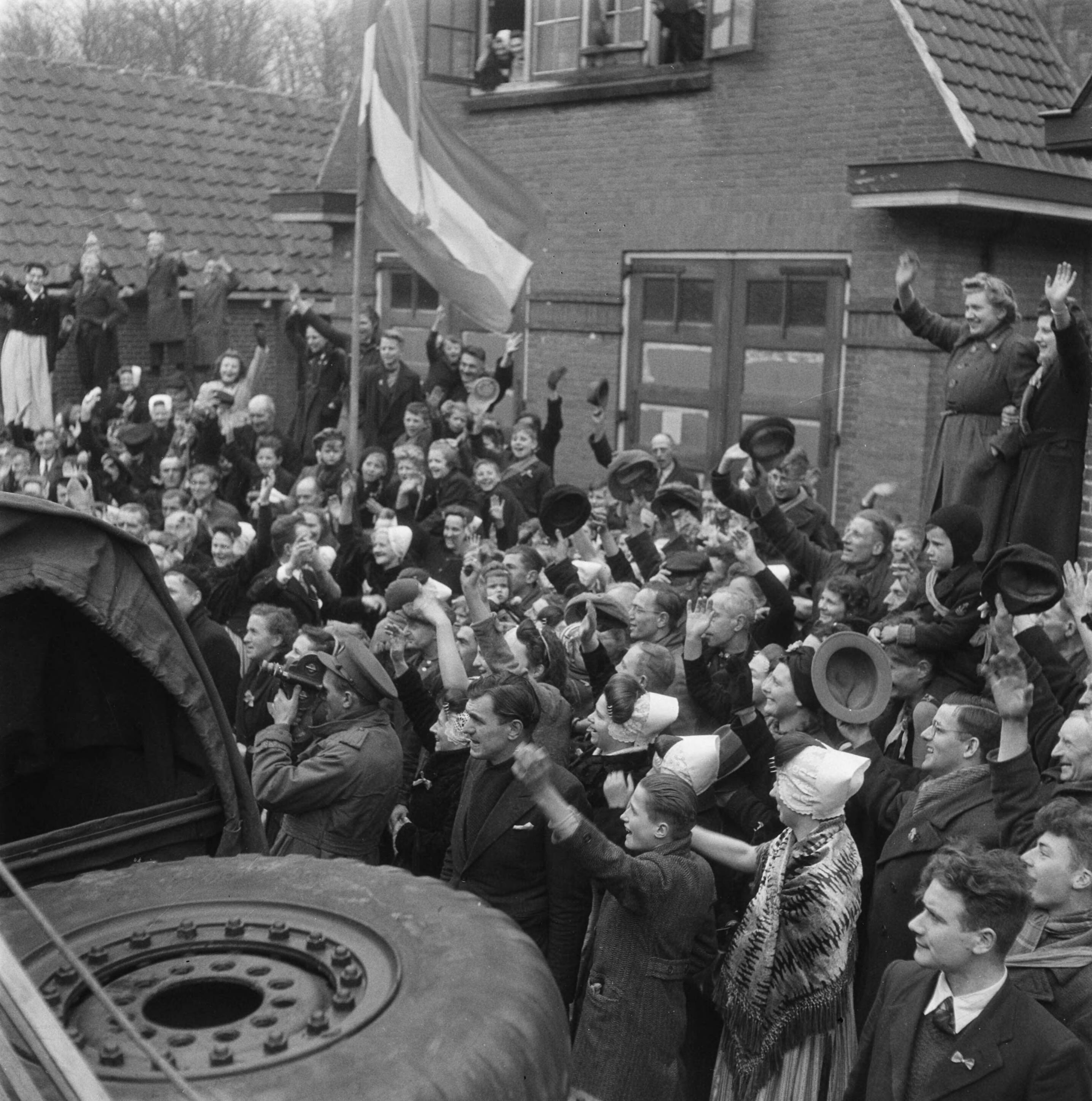 Domburg. De colonne van koningin Wilhemina wordt toegezwaaid en toegejuichd door een menigte