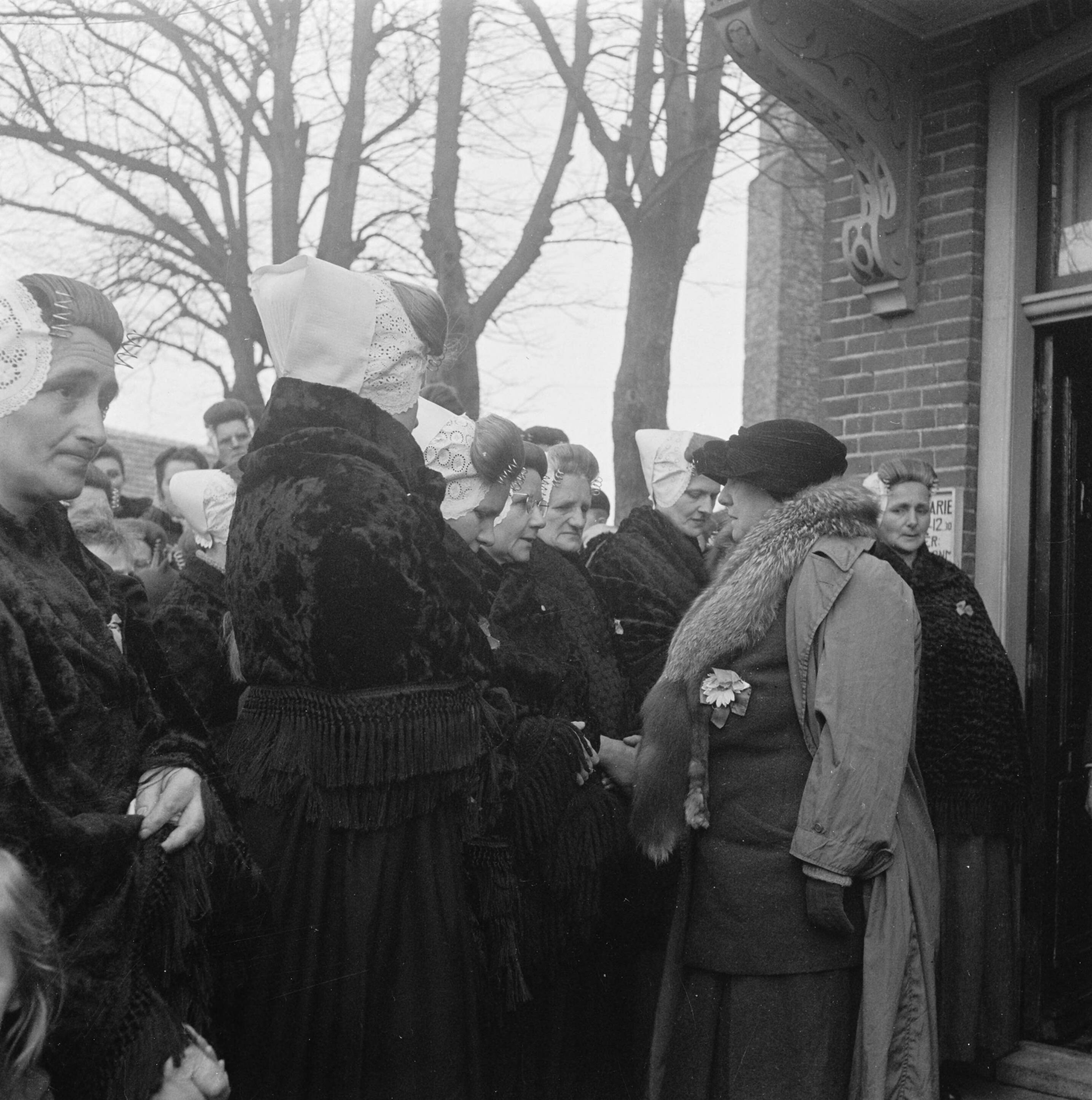 Walcheren. Koningin Wilhelmina in gesprek met vrouwen in klederdracht bij een gemeentehuis of -secretarie