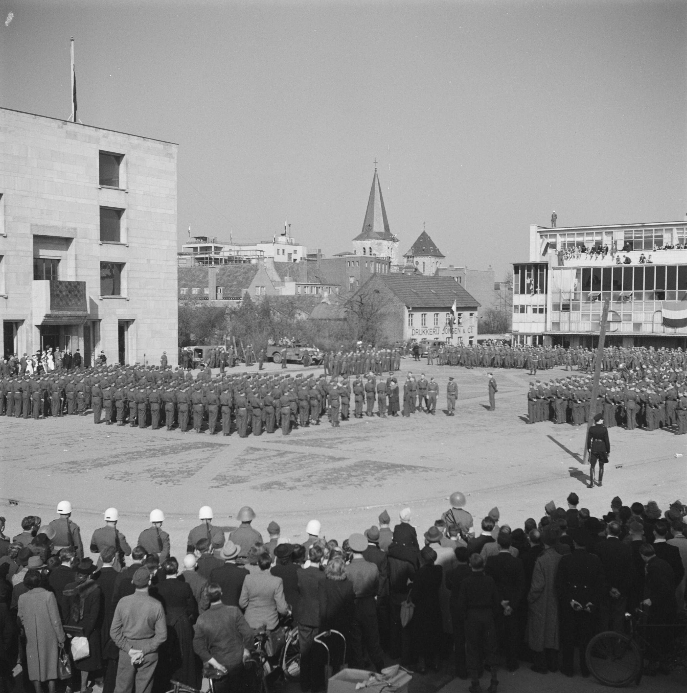 Heerlen. Koningin Wilhelma inspecteert een aantal compagniën Stoottroepen op het Raadhuisplein van Heerlen