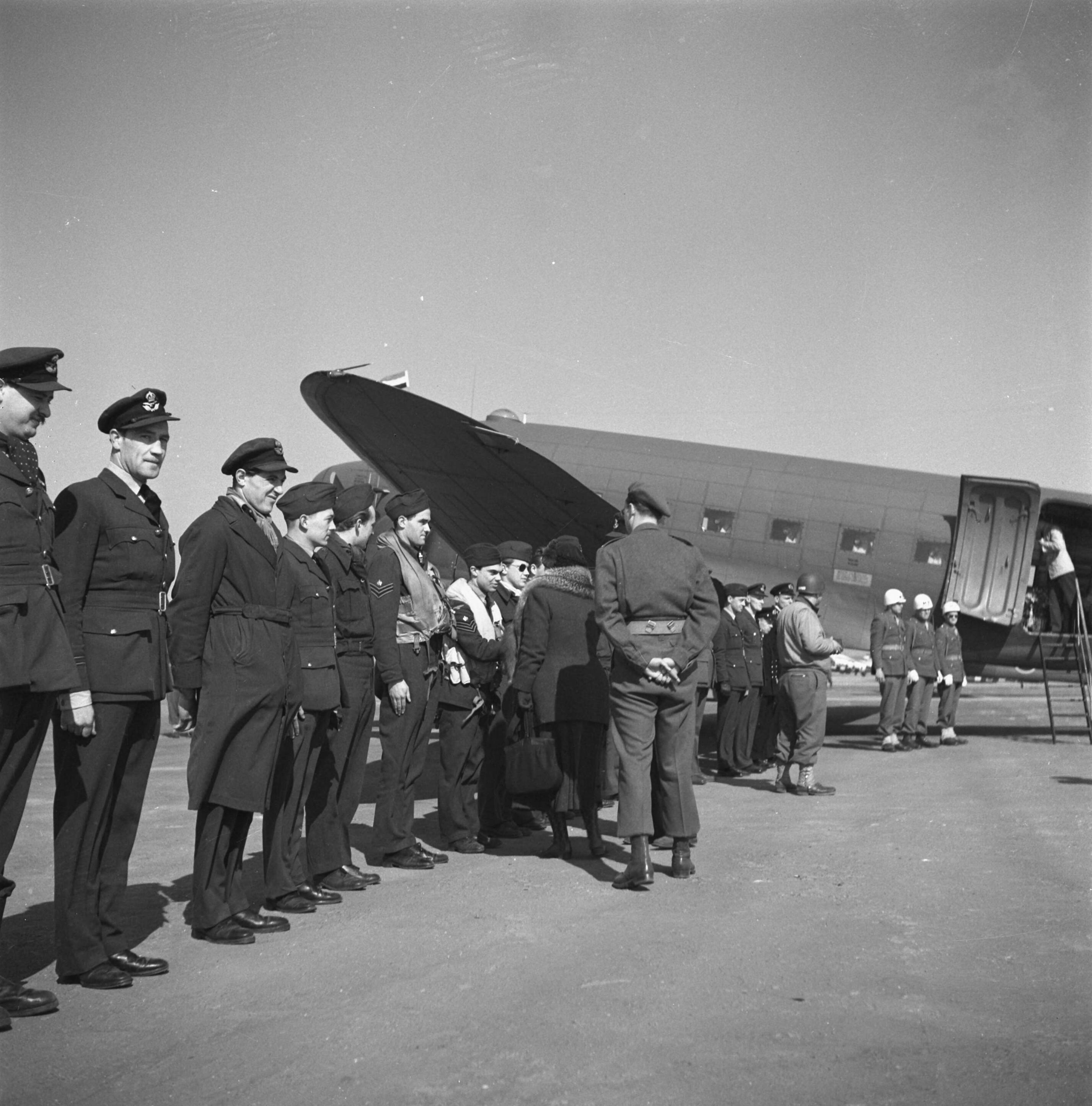 Vliegveld nabij Venlo, waar een Dakota van de Marine Luchtvaartdienst gereed staat voor de terugvlucht naar Londen. Koningin Wilhelmina, met achter haar prins Bernhard, schudt handen van een crewleden.