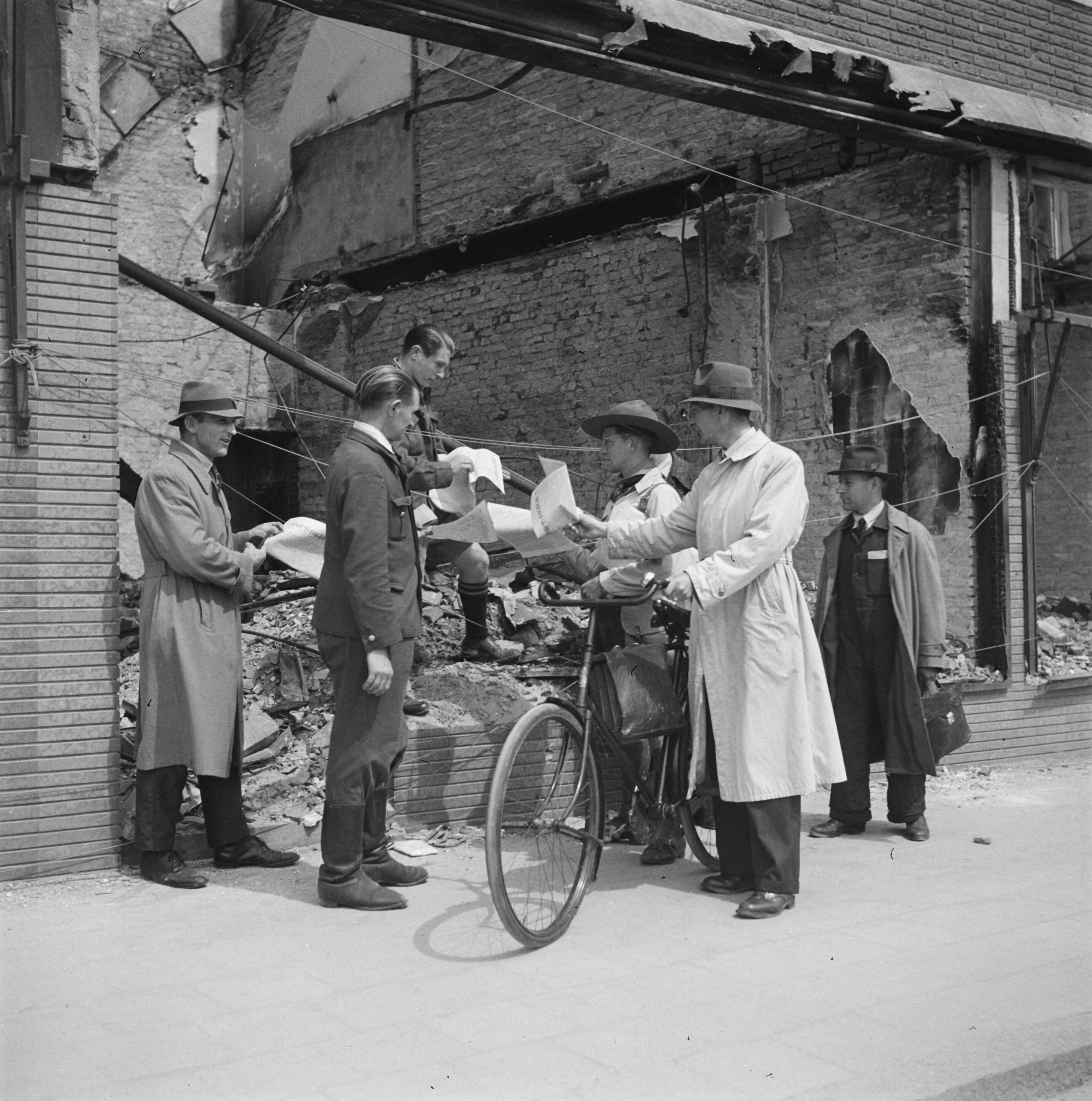 De katholieke krant "Arnhems Dagblad" wordt uitgedeeld aan arbeiders en burgers. Onder hen een man in padvindersuniform