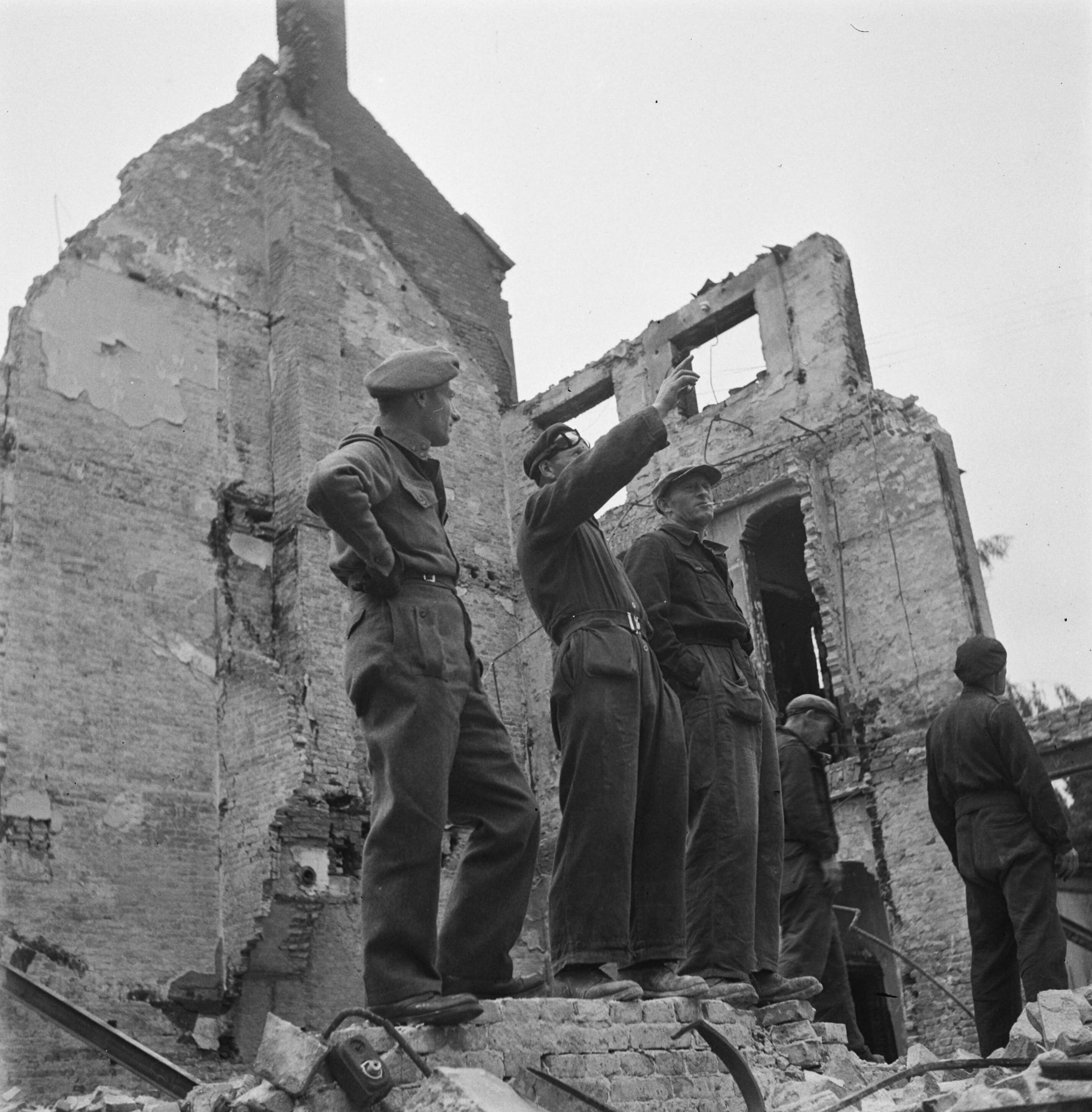 Mannen staan op de puinhopen van een verwoest gebouw