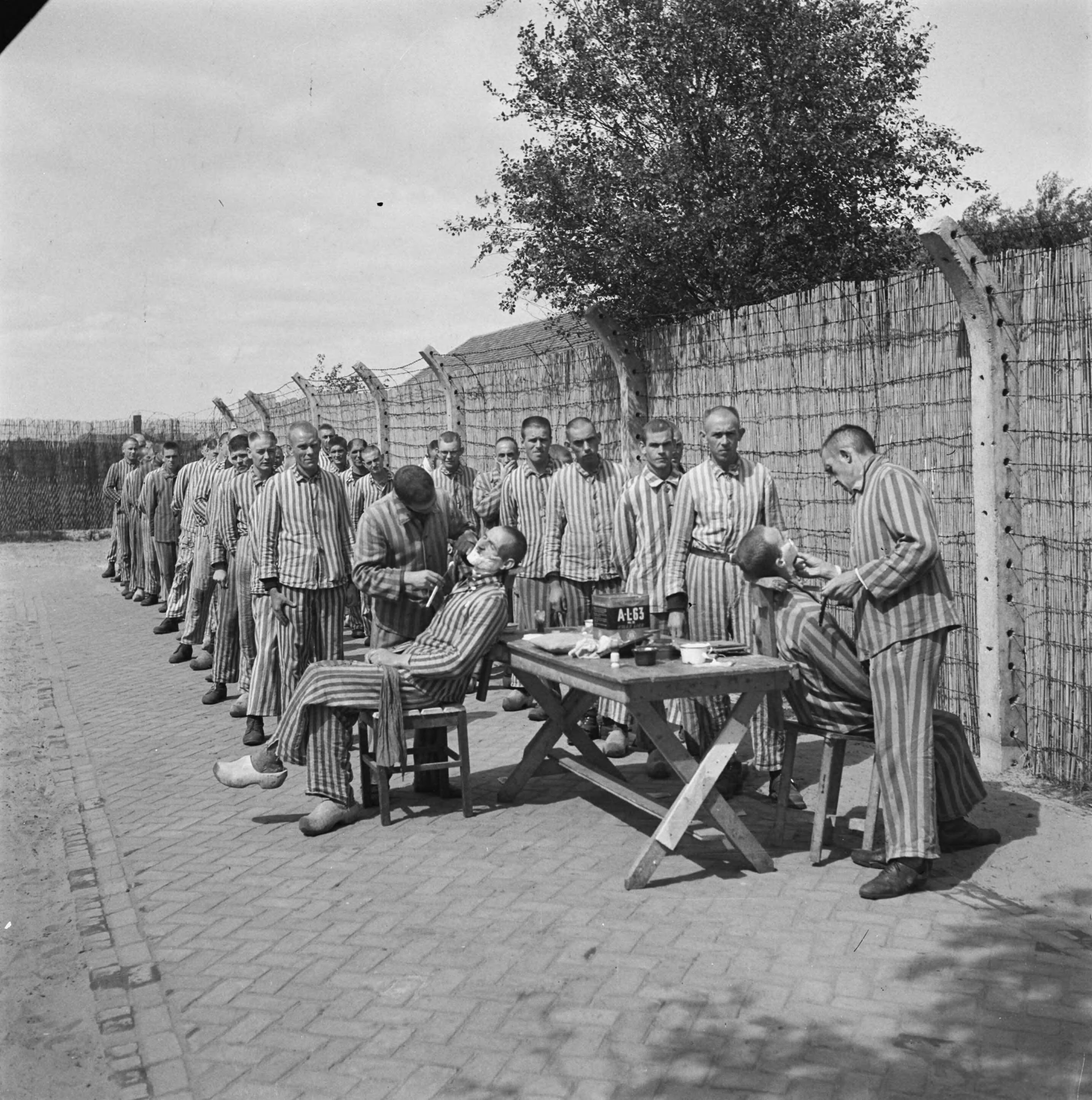 In het strafkamp te Vught, zijn 7000 Nederlandse collaborateurs en landverraders opgesloten. Soldaten van de Nederlandse Stoottroepen zijn met met de bewaking belast, speciaal van de 300 Nederlandse SS-mannen. Onder leiding van de kampcommandant, de majoor L. Mennes, en zijn helpers, worden deze gevangenen gebruikt om o.a. de omgeving van Vught van landmijnen te zuiveren. Ze zijn gekleed in de blauw-wit gestreepte gevangeninspakjes van de voormalige door de Duitsers gevangen genomen Nederlanders. De gevangenen krijgen het minimum burgerrantsoen, dat bovendien nog verminderd is, omdat alle lekkernijen er af zijn gehaald. In afwachting van hun definitieve berechting brengen zij hier de dagen onder een streng regime door. Foto: Het scheren is toegestaan en gebeurt door de gevangenen zelf. Het is de vraag of het uiterlijk van de landverraders er aantrekkelijker door wordt.