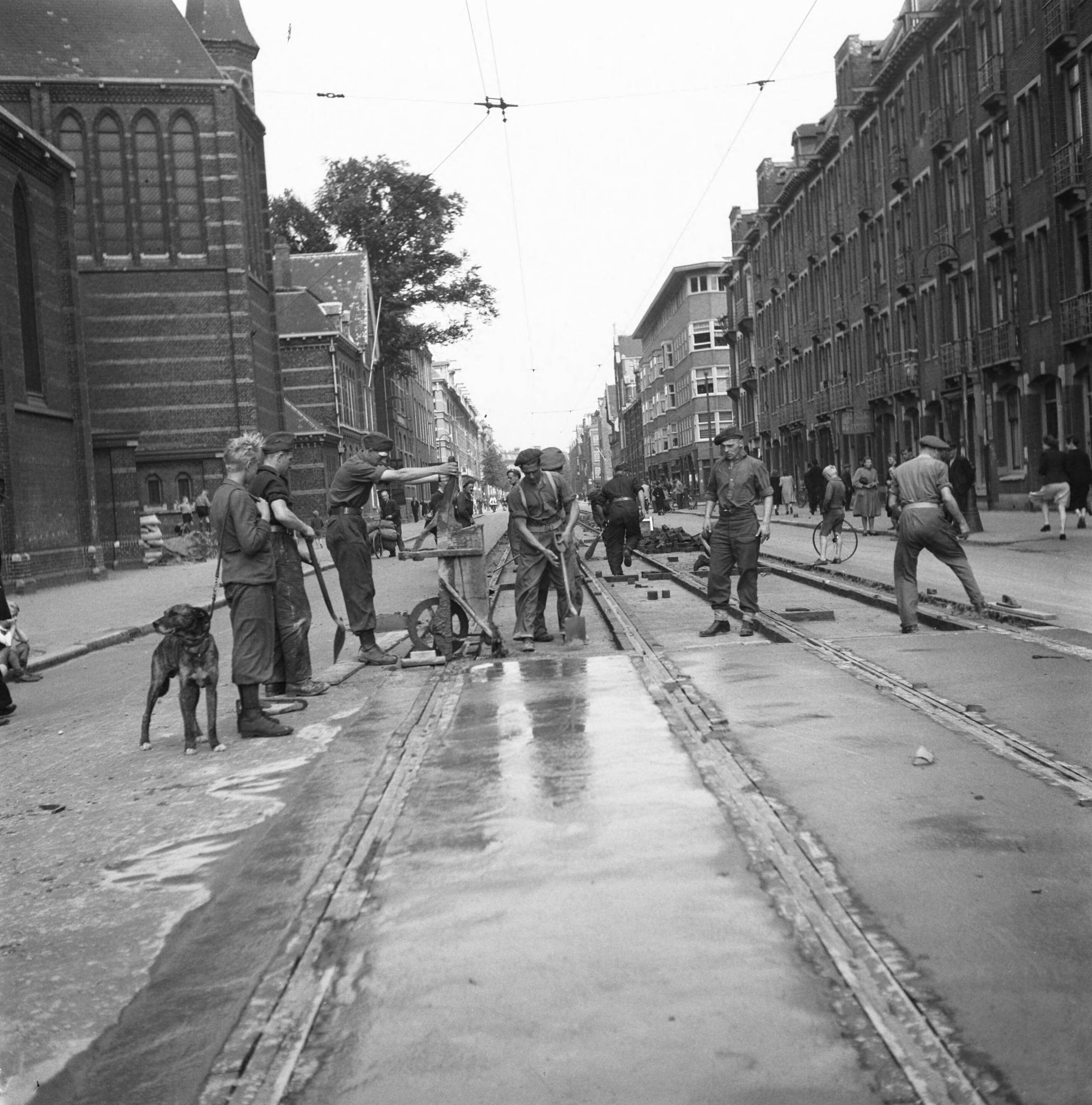 Amsterdam. Spaarndammerstraat bij de H. Maria Magdalenakerk. Onder leiding van de kapitein J. Breman is de 2e Genie Compagnie te Amsterdam begonnen met herstelwerkzaamheden van zeer vergaande strekking. Haar taak is zo snel mogelijk alle verkeersbelemmeringen in de stad Amsterdam uit de weg te ruimen, waaronder begrepen opruimingswerkzaamheden in de haven. Het werk bestaat verder uit door door de Duitsers gemaakte versperringen in de straten op te ruimen, de gapingen in het wegdek, veroorzaakt door houten blokjes, te dichten: ondergelopen kelders leeg te pompen, enz.