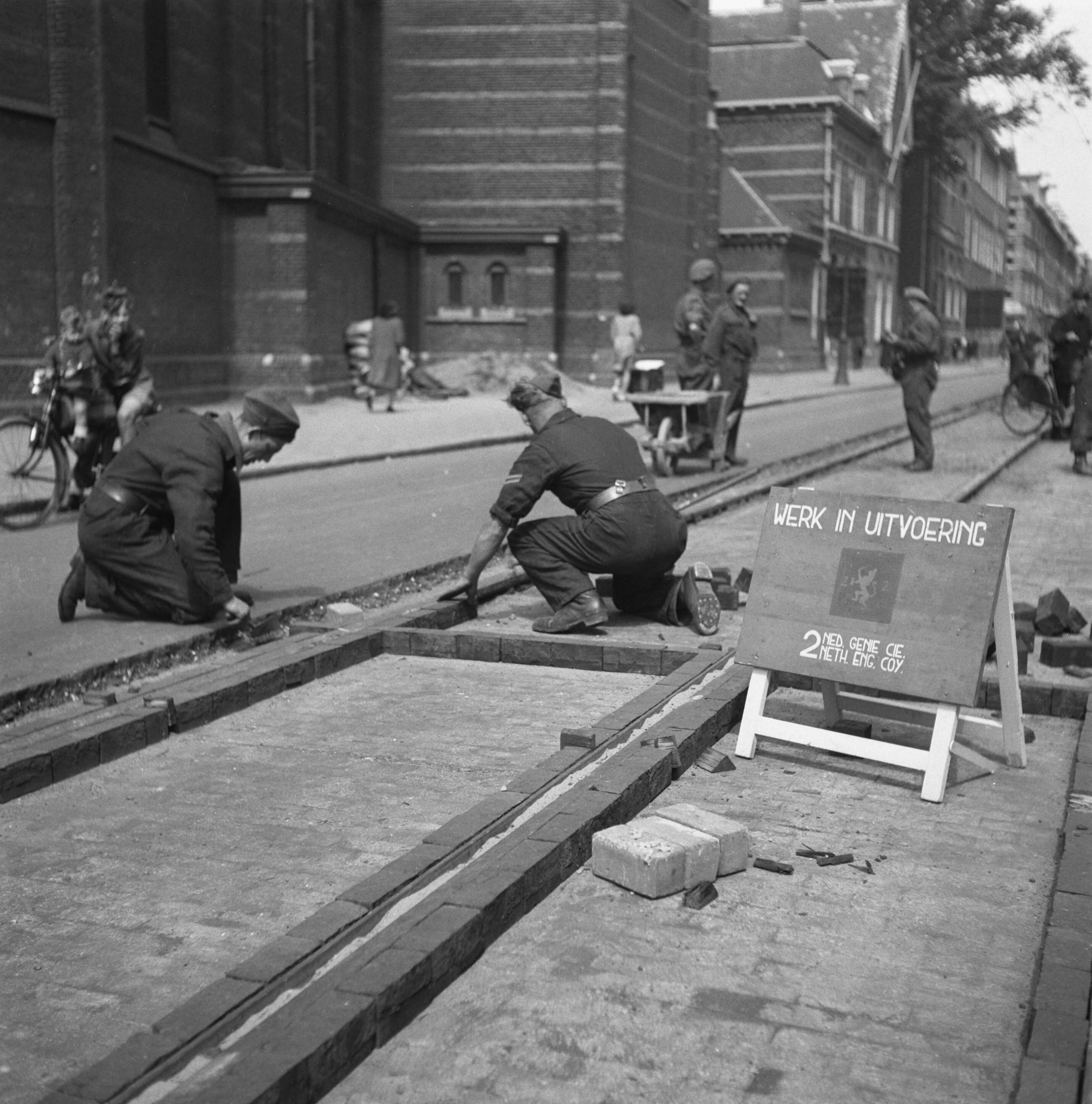 Amsterdam. Spaarndammerstraat bij de H. Maria Magdalenakerk. Onder leiding van de kapitein J. Breman is de 2e Genie Compagnie te Amsterdam begonnen met herstelwerkzaamheden van zeer vergaande strekking. Haar taak is zo snel mogelijk alle verkeersbelemmeringen in de stad Amsterdam uit de weg te ruimen, waaronder begrepen opruimingswerkzaamheden in de haven. Het werk bestaat verder uit door door de Duitsers gemaakte versperringen in de straten op te ruimen, de gapingen in het wegdek, veroorzaakt door houten blokjes, te dichten: ondergelopen kelders leeg te pompen, enz.