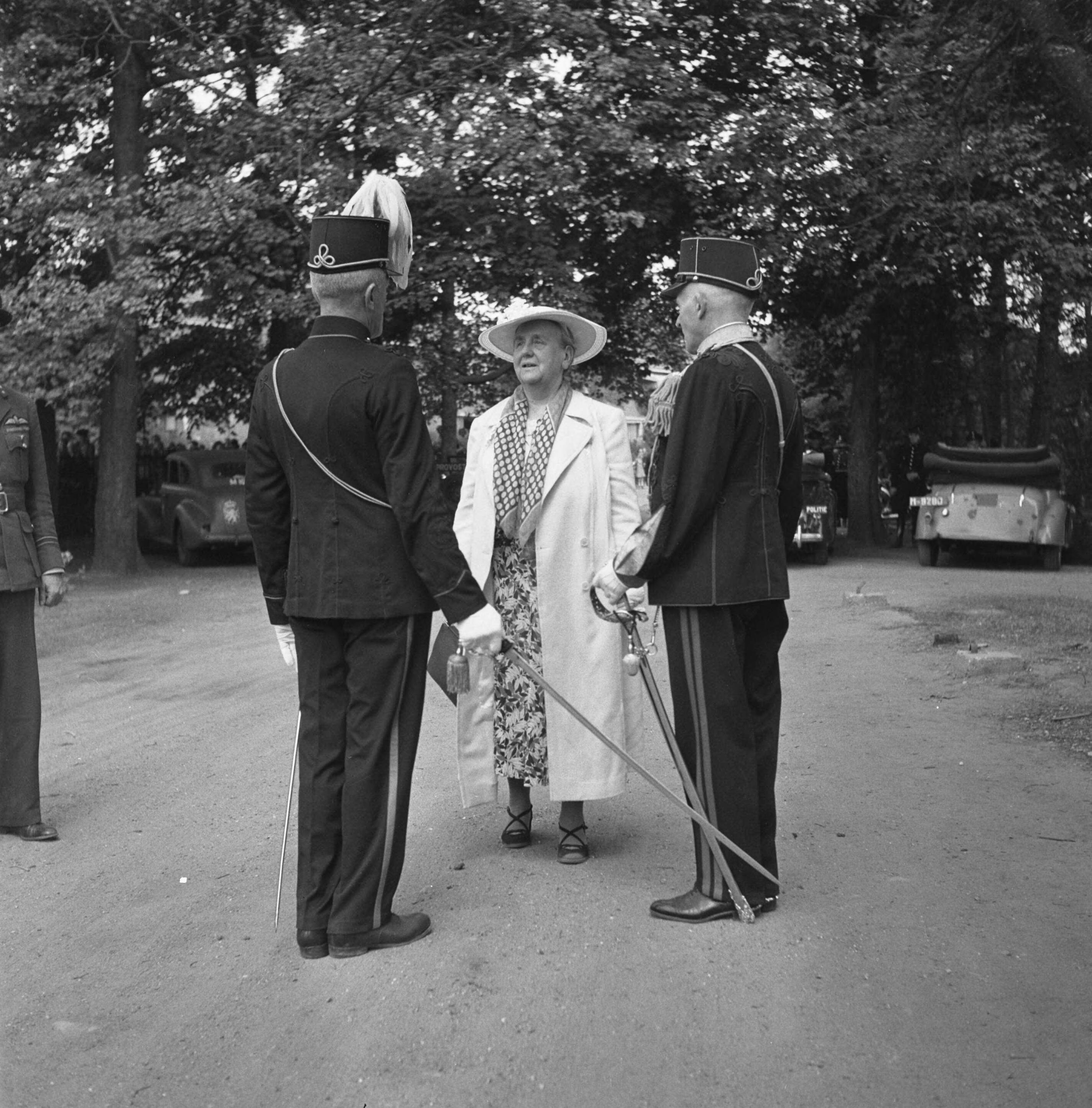 Koningin Wilhelmina in gesprek met twee bewoners van Bronbeek