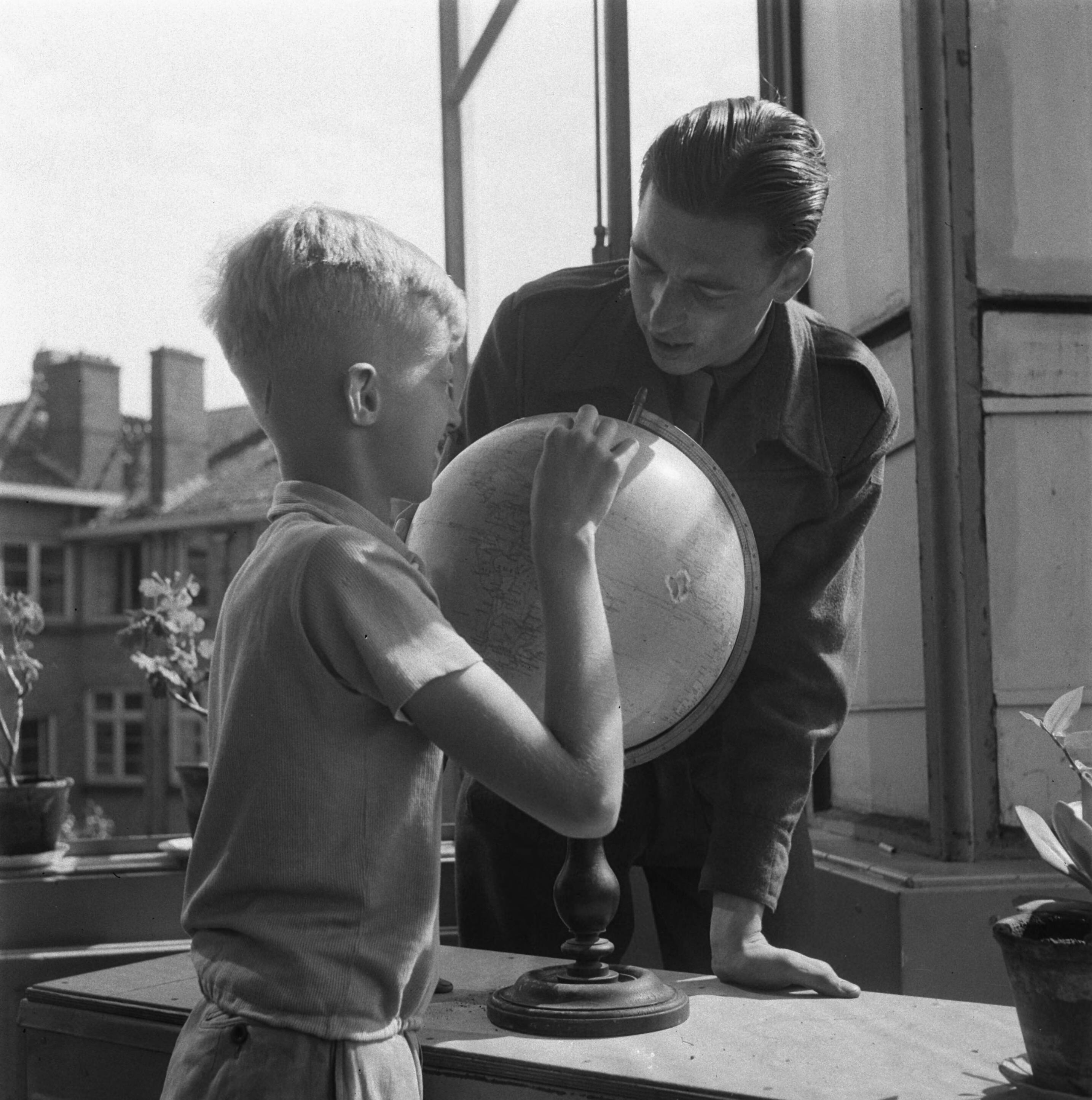 Jongen bij een wereldbol. Tegenover hem een geuniformeerde man