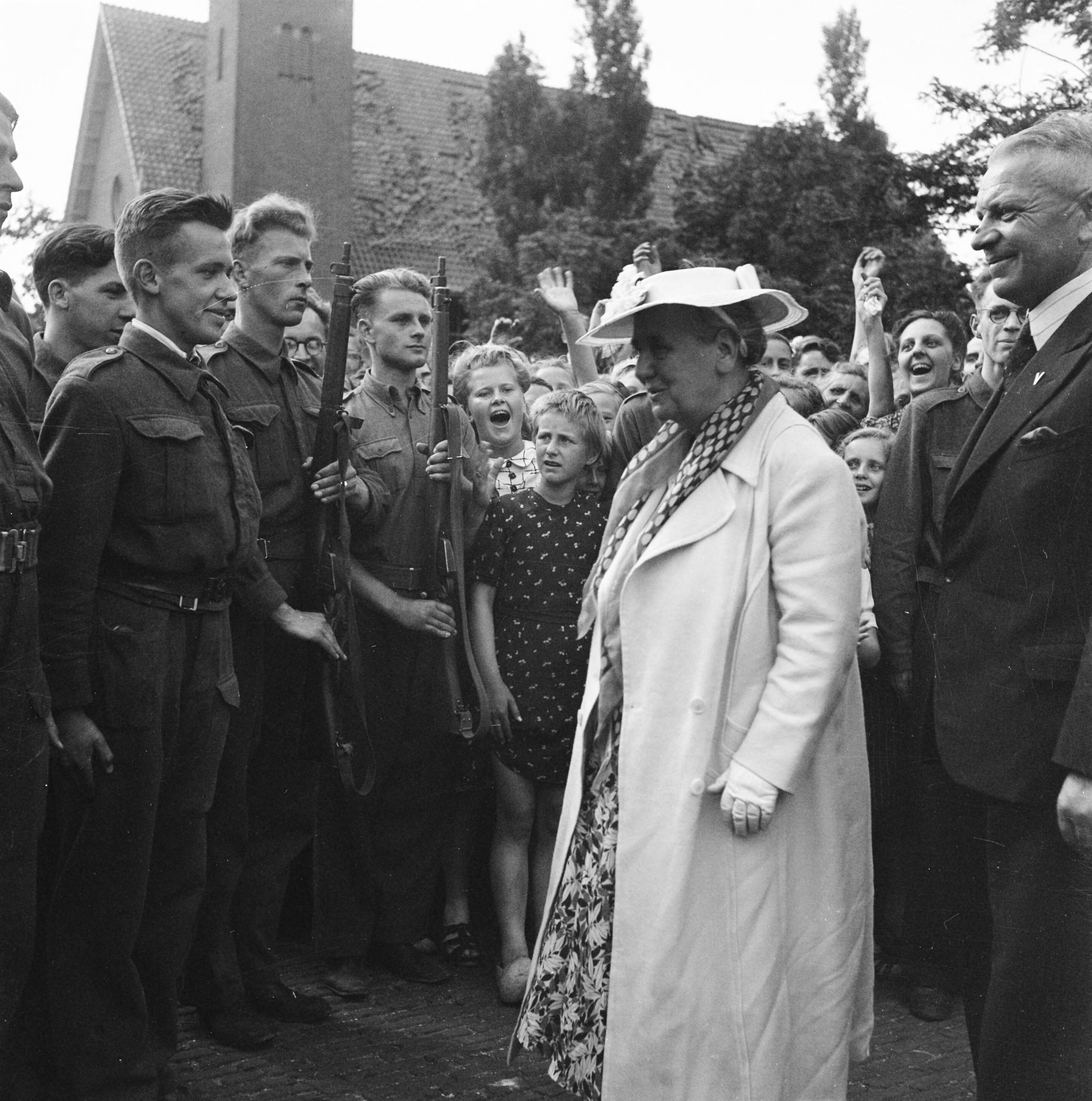 Koningin Wilhelmina wordt toegejuicht, Jonge geuniformeerde mannen staan met geweer in aanslag