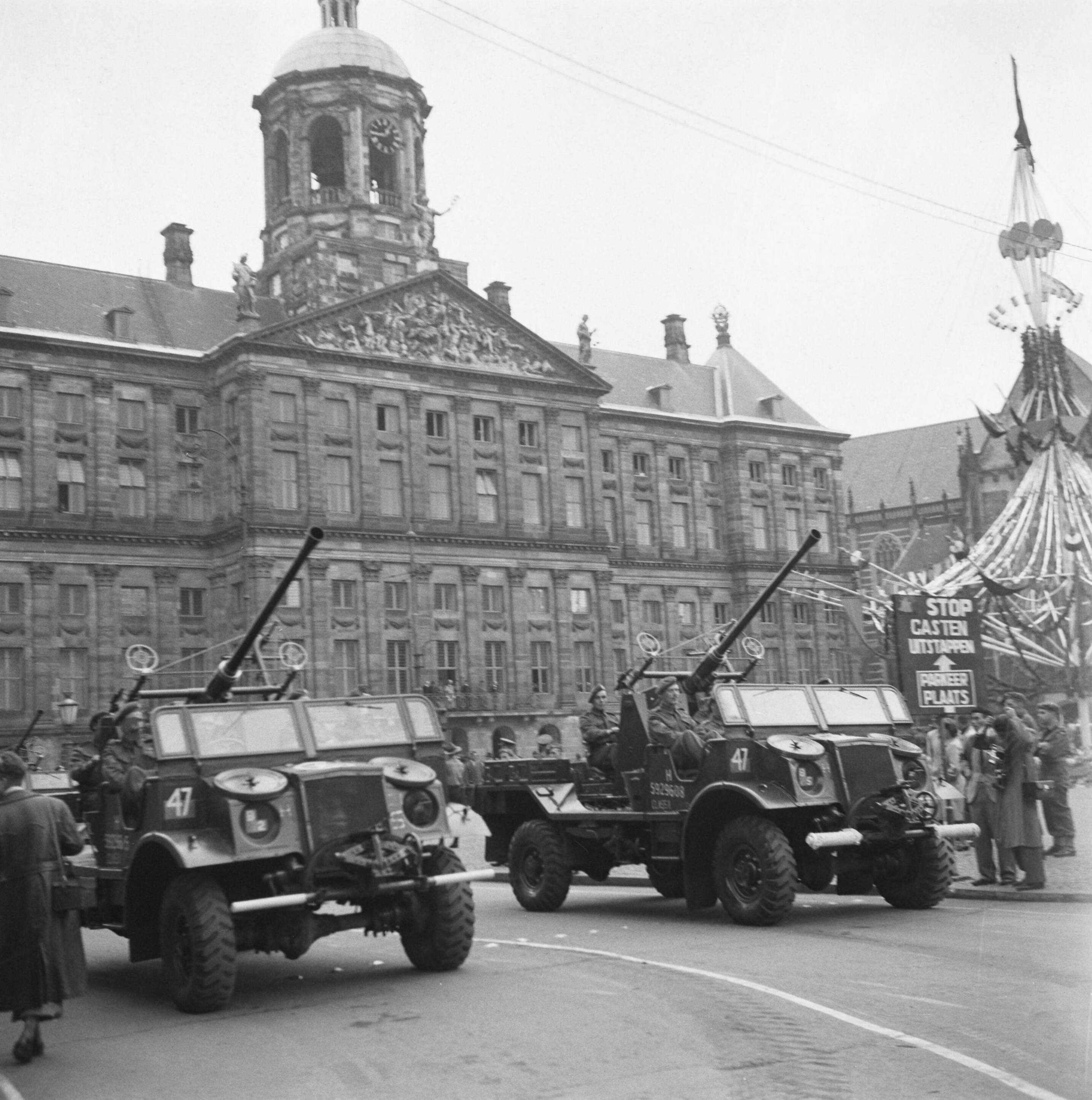Gemotoriseerde Bofors kanonnen van het 2e Light Anti Aircraft Regiment defileren voor de koningin op het bordes van het Paleis op de Dam
