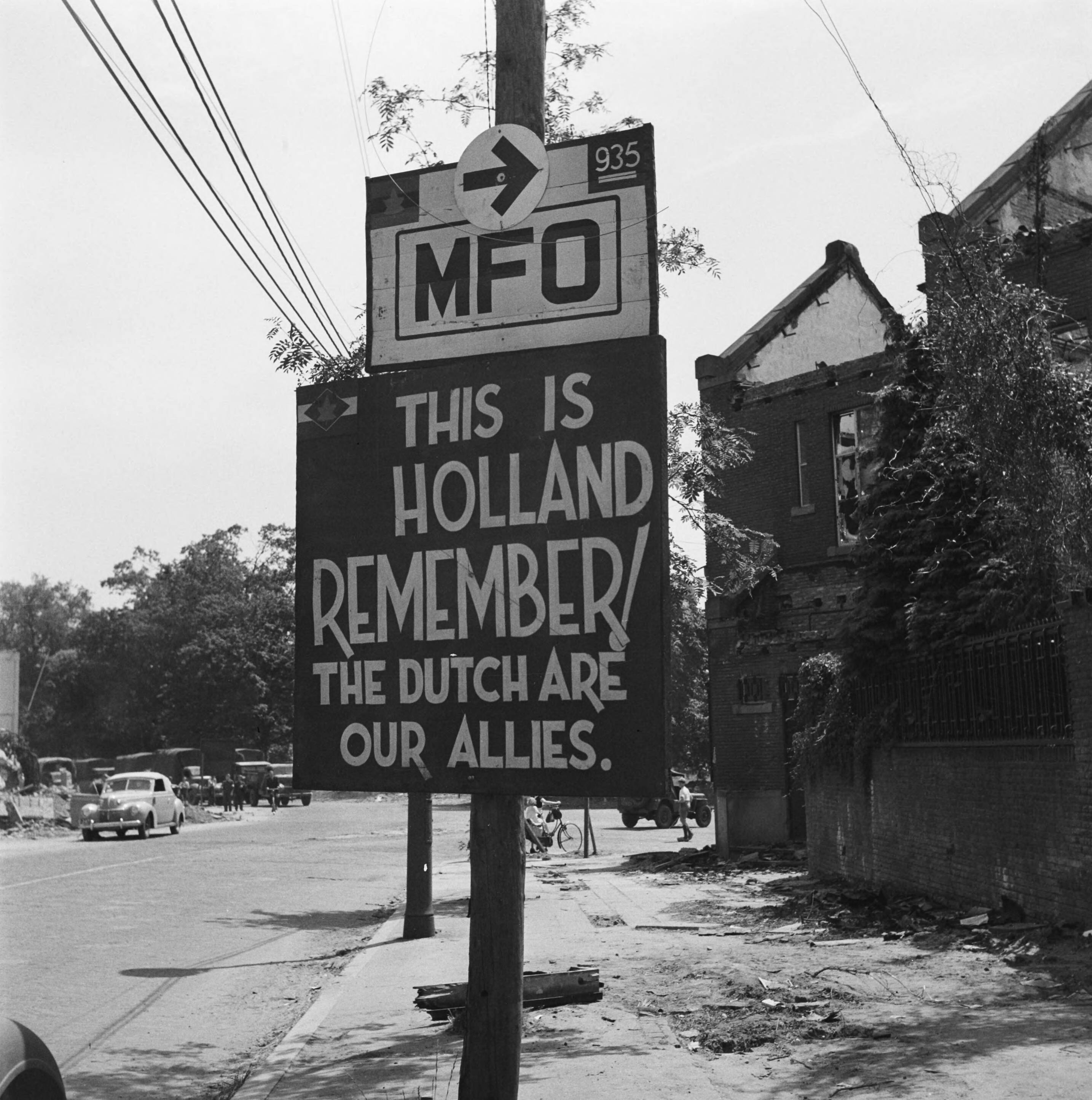 Bord met opschrift "This is Holland, REMEMBER, the Dutch are our allies".