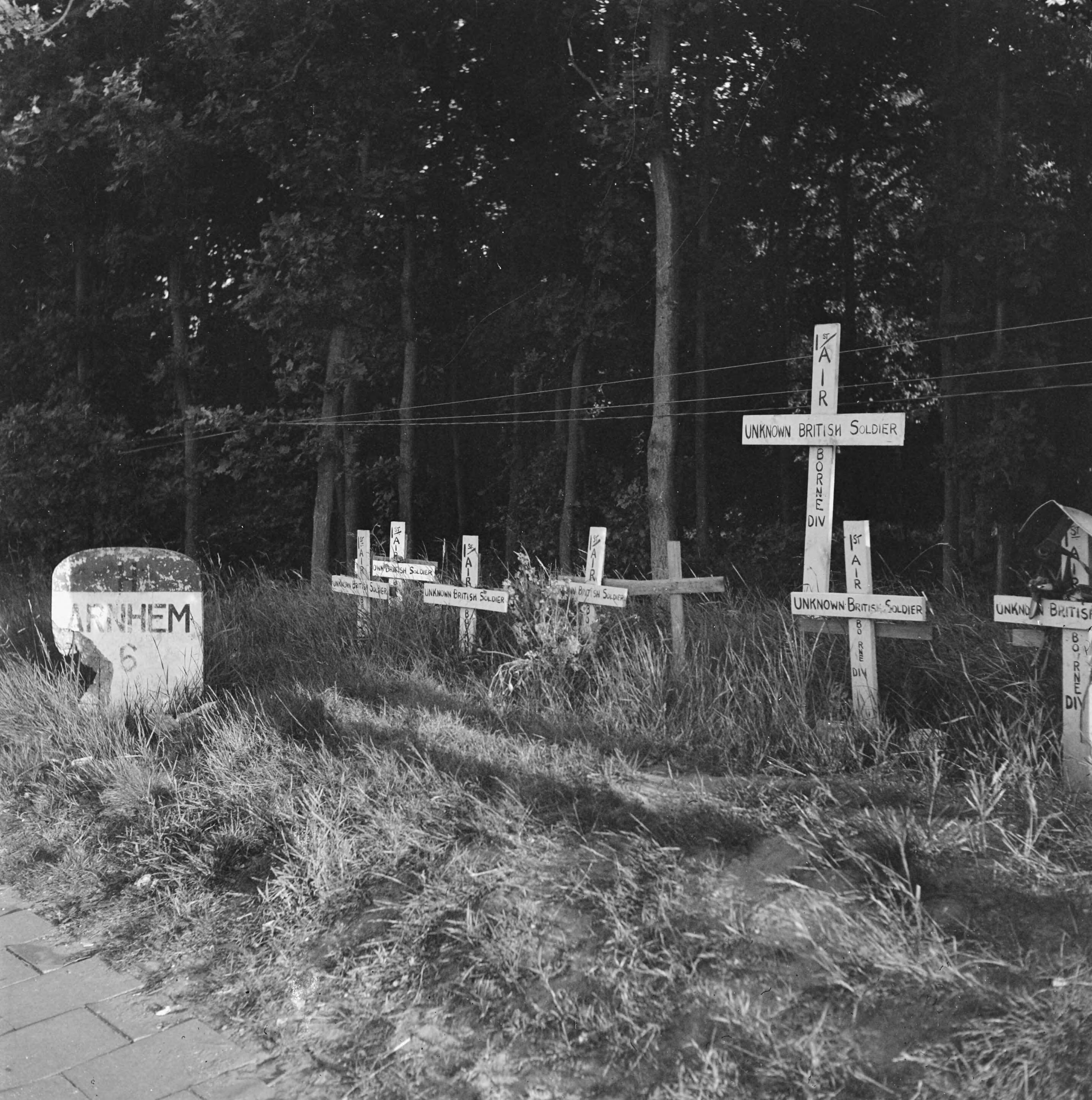 Kilometersteen Arnhem 6 km. Daarnaast een reeks graven met houten kruizen en het opschrift "1st Airbone Div.