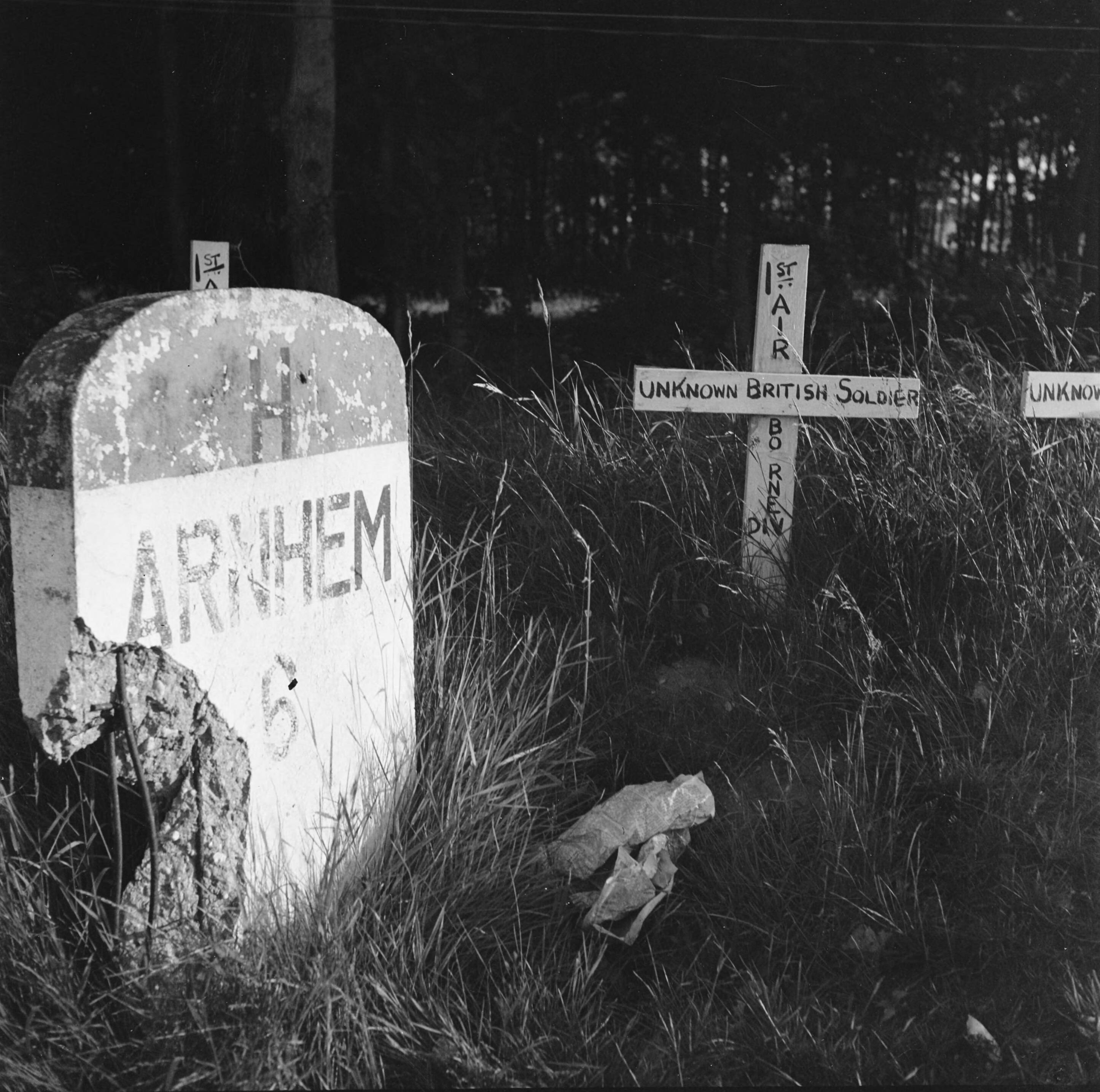 Kilometersteen Arnhem 6 km. Daarnaast een reeks graven met houten kruizen en het opschrift "1st Airbone Div. Unknown British Soldier"