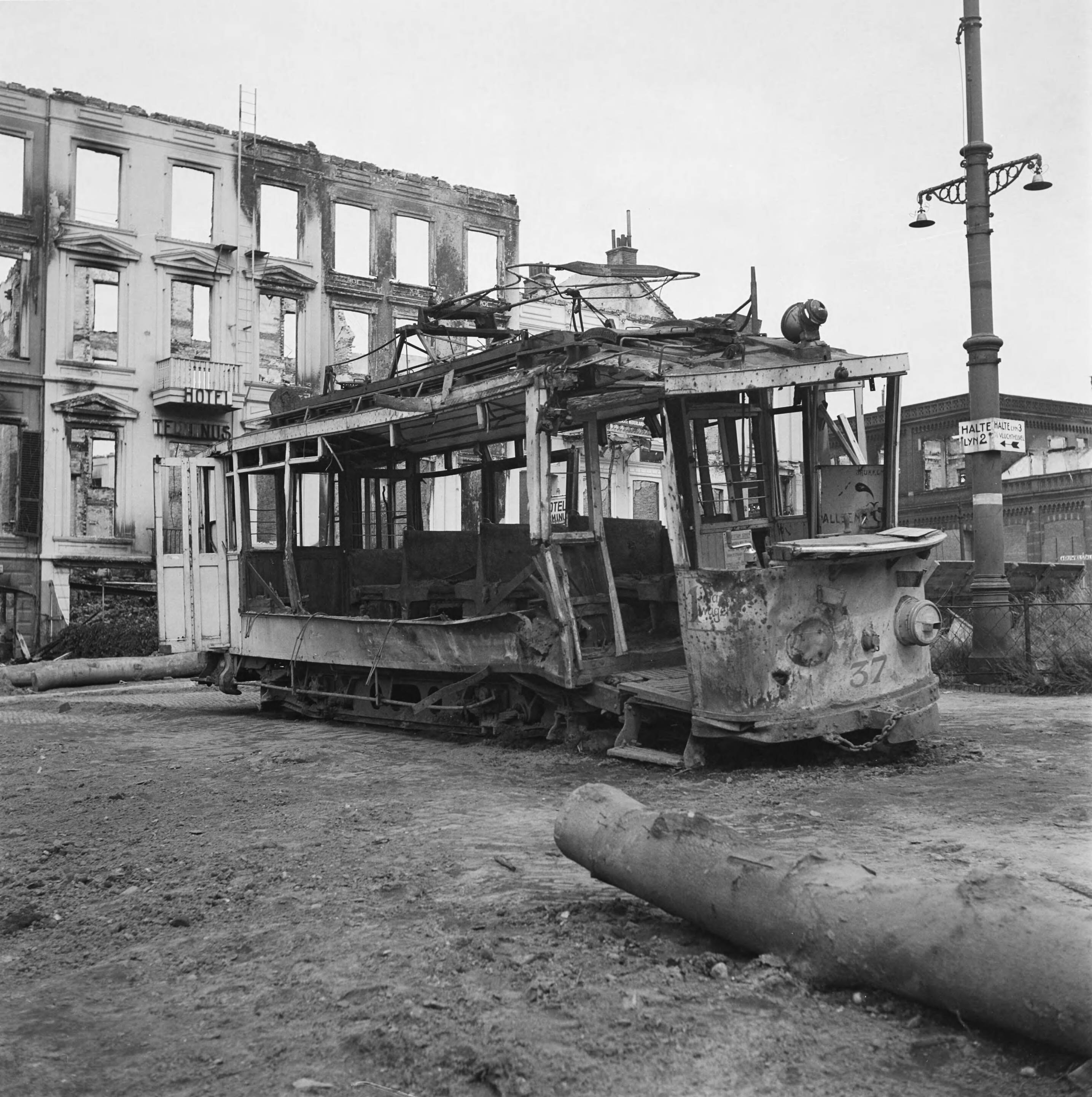 Westzijde Stationsplein met hotel Terminus. Op de voorgrond een uitgebrande tram