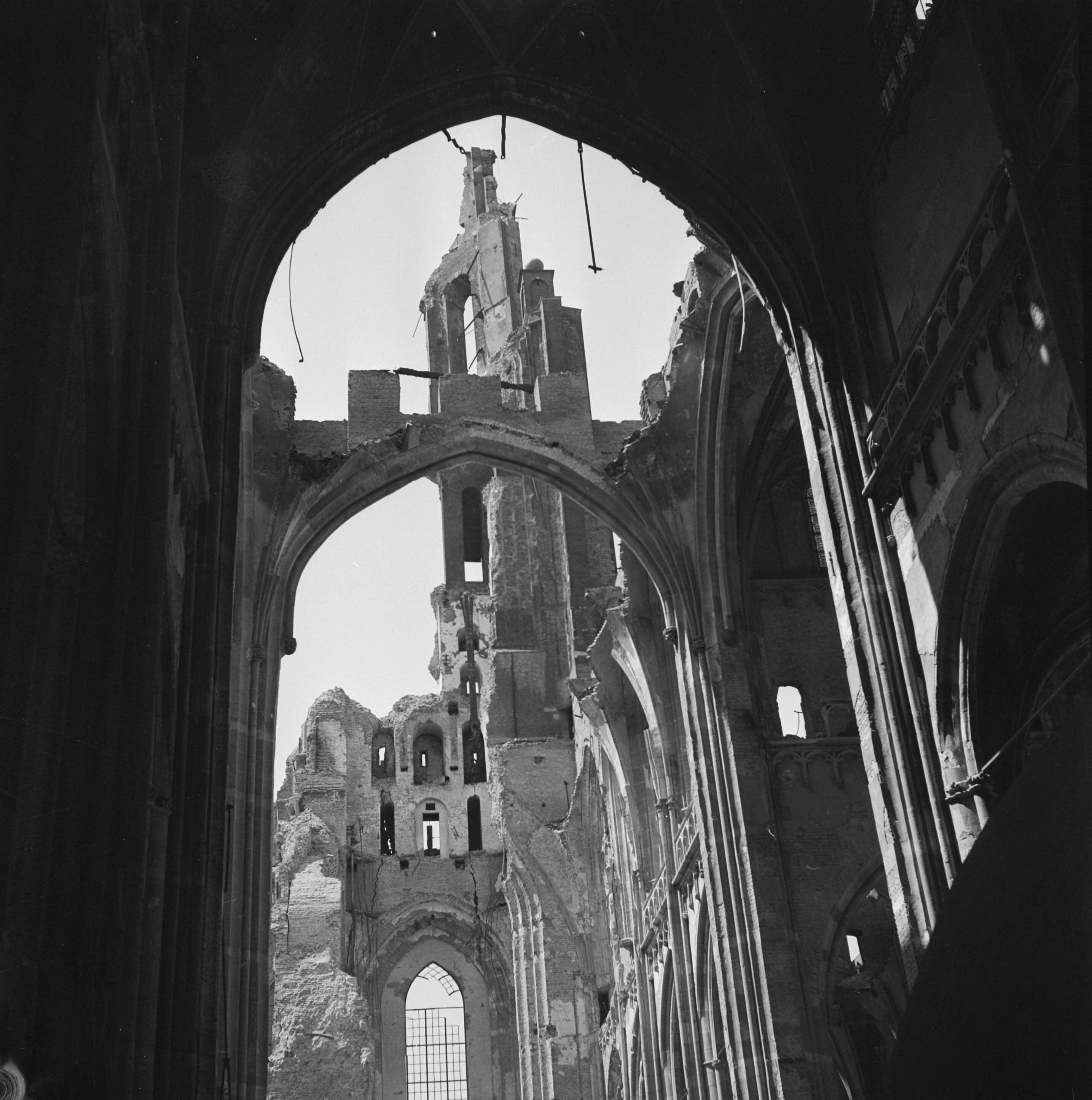 Gezicht op de toren van de Grote- of St. Eusebiuskerk vanuit het koor van de kerk