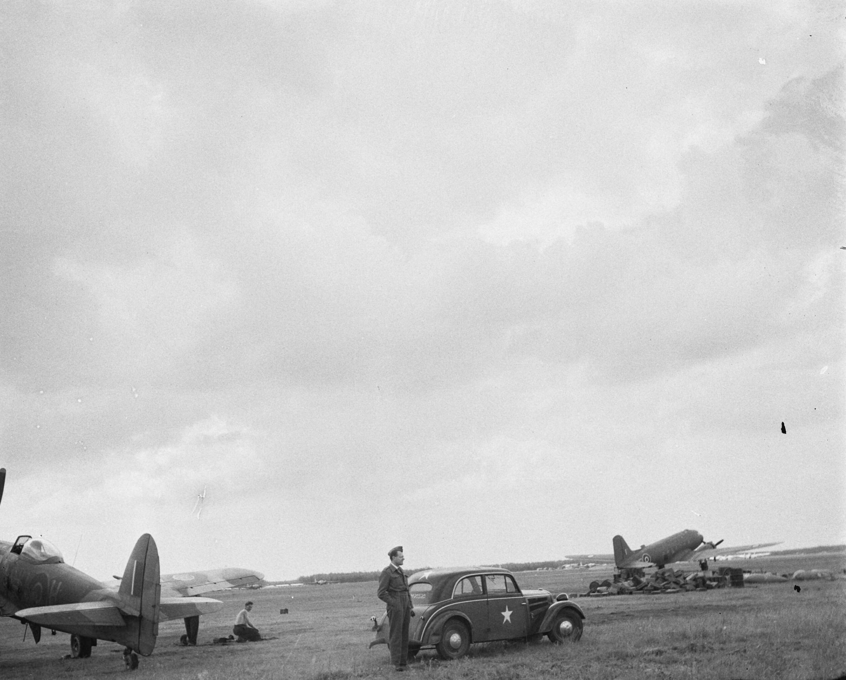 Vliegveld Eindhoven. Vliegtuigen en een stafauto