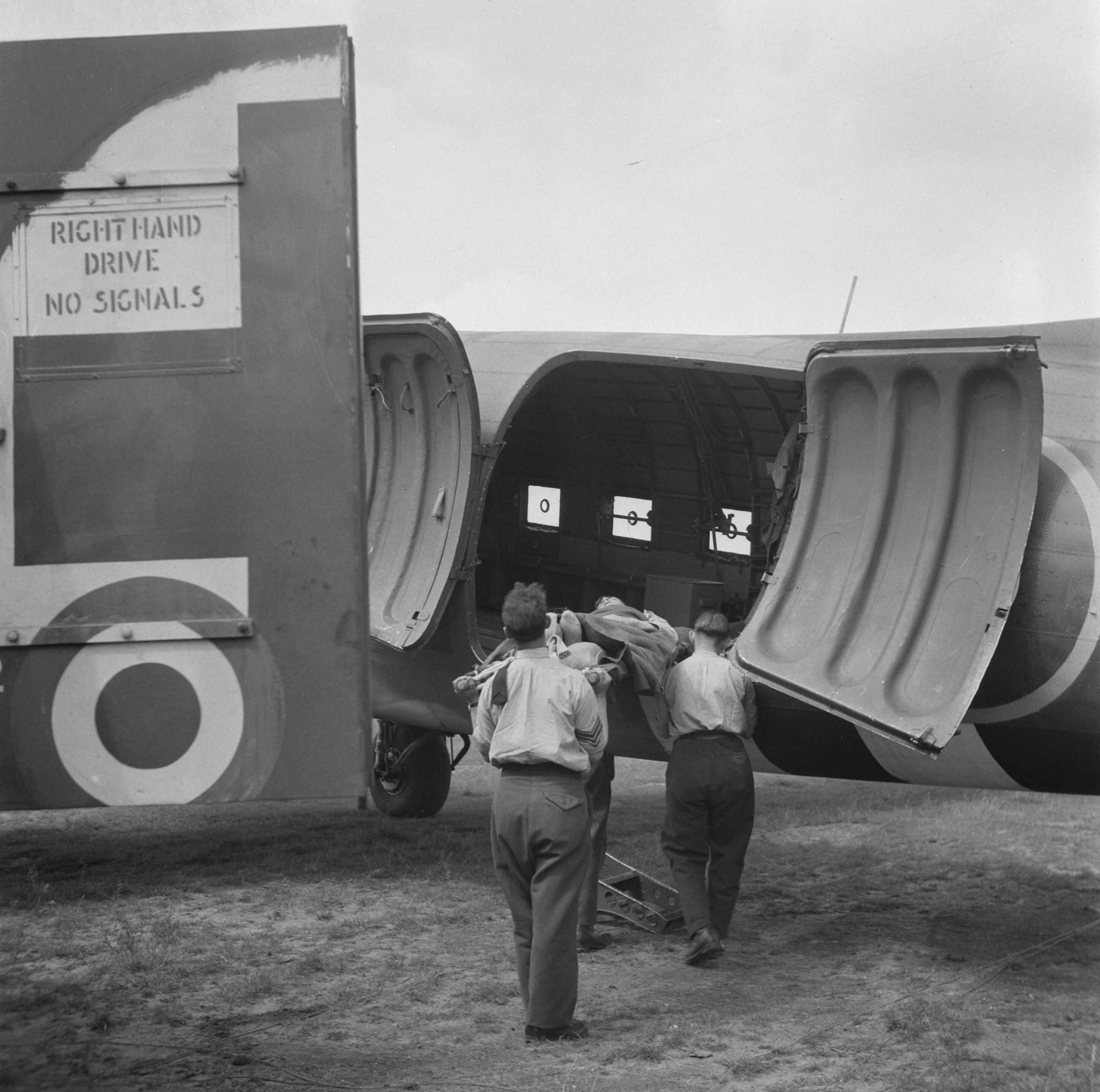 Vliegveld Eindhoven. Een zieke of gewonde wordt uit een ambulance geladen en overgebracht naar een gereedstaand vliegtuig