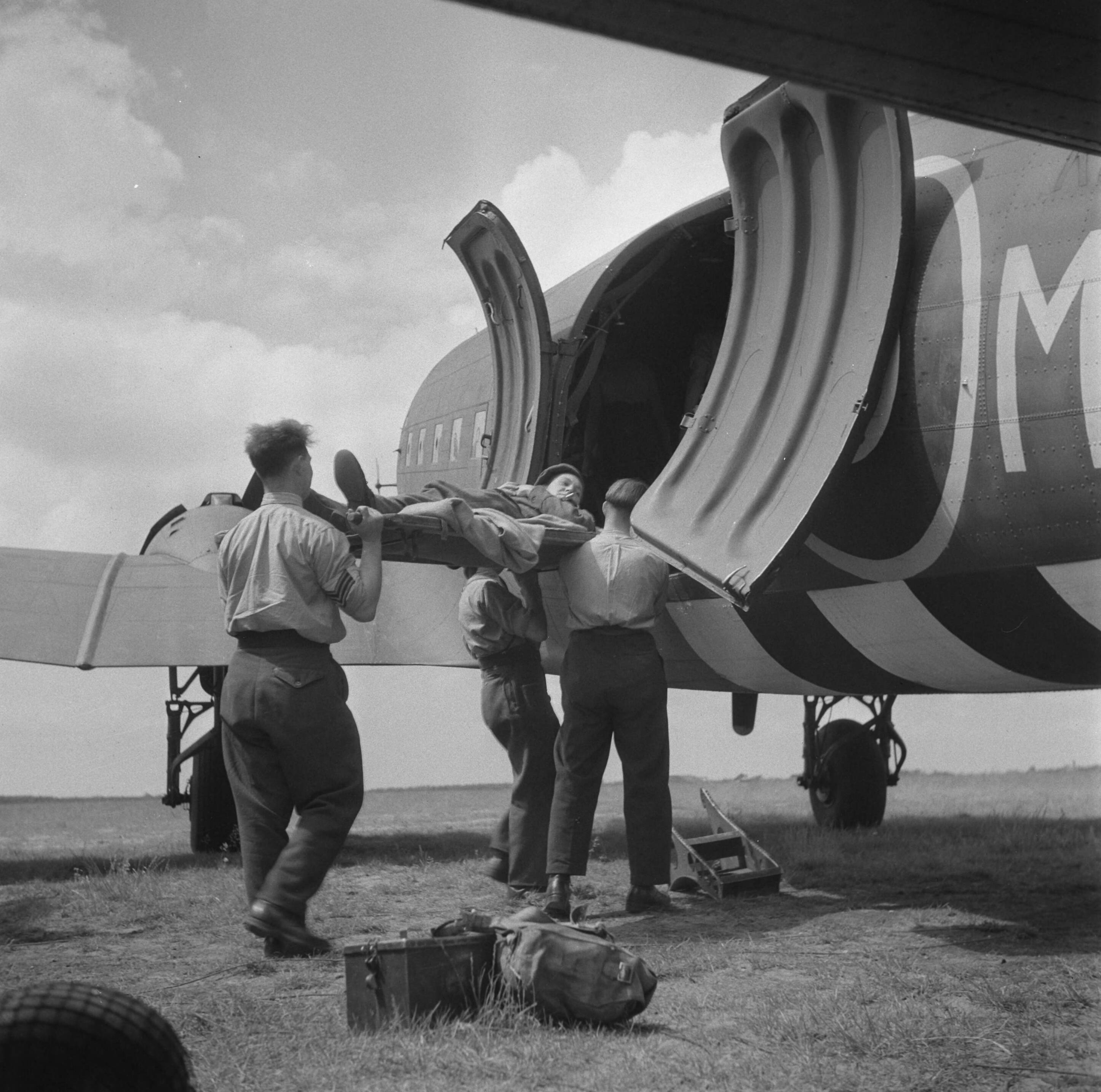 Vliegveld Eindhoven. Een zieke of gewonde wordt uit een ambulance geladen en overgebracht naar een gereedstaand vliegtuig