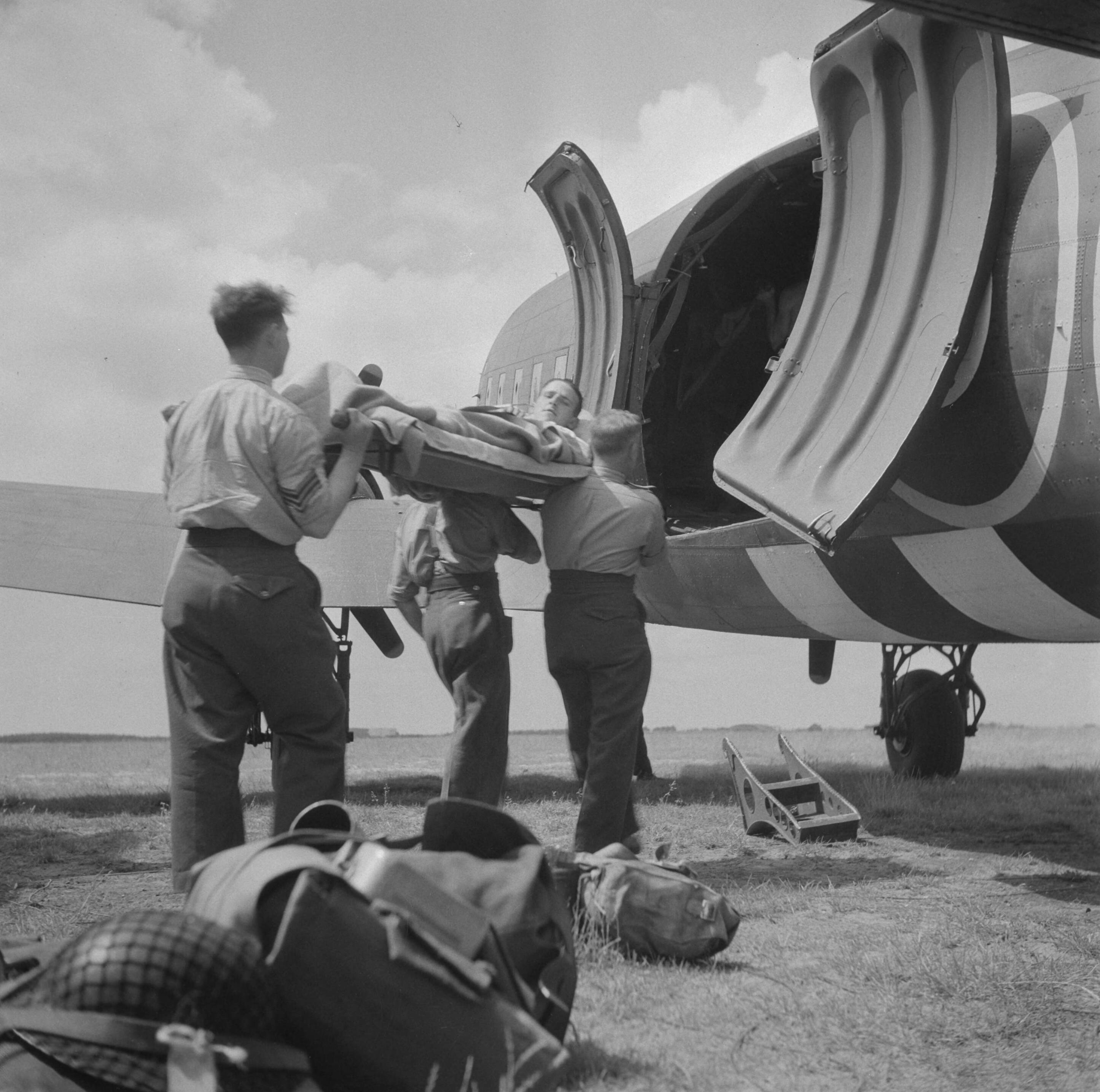 Vliegveld Eindhoven. Een zieke of gewonde wordt uit een ambulance geladen en overgebracht naar een gereedstaand vliegtuig